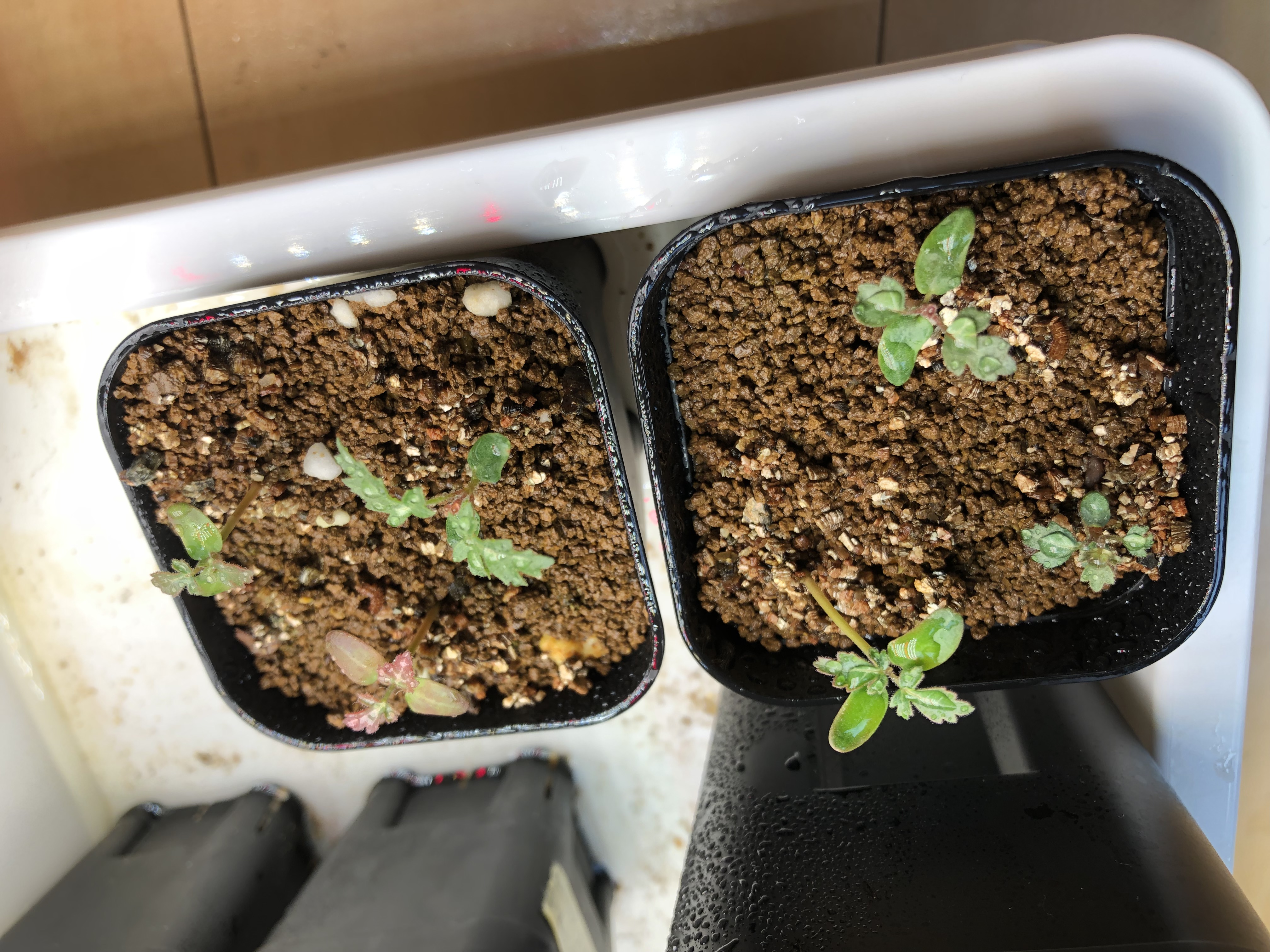 〇20㍉くらいのプラグトレーに赤玉土(細粒)を敷き、種撒き、バーミキュライトで5㍉覆土、腰水管理、湿度維持のフタやカバー等なし、サーキュレーターで部屋全体の換気、パネル型のLEDライト照射、種の加工なし、発芽後はプレステラ75に植え替え