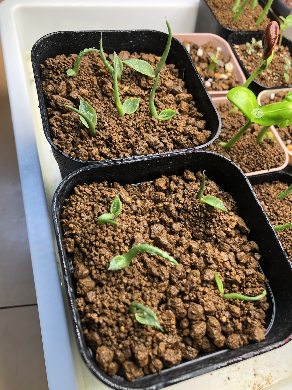 〇長めのプレステラ90へプロトリーフ・観葉植物の土+30%バーミキュライトを入れ、表面に赤玉土(小粒)を敷いた、覆土なし、腰水管理、鉢ごと透明ケースに入れ湿度維持の為にフタ(隙間を最大1センチ程空けて)、サーキュレーターで部屋全体の換気、パネル型のLEDライト照射、種の加工なし、発芽後は支える目的で赤玉土(細粒)を追加