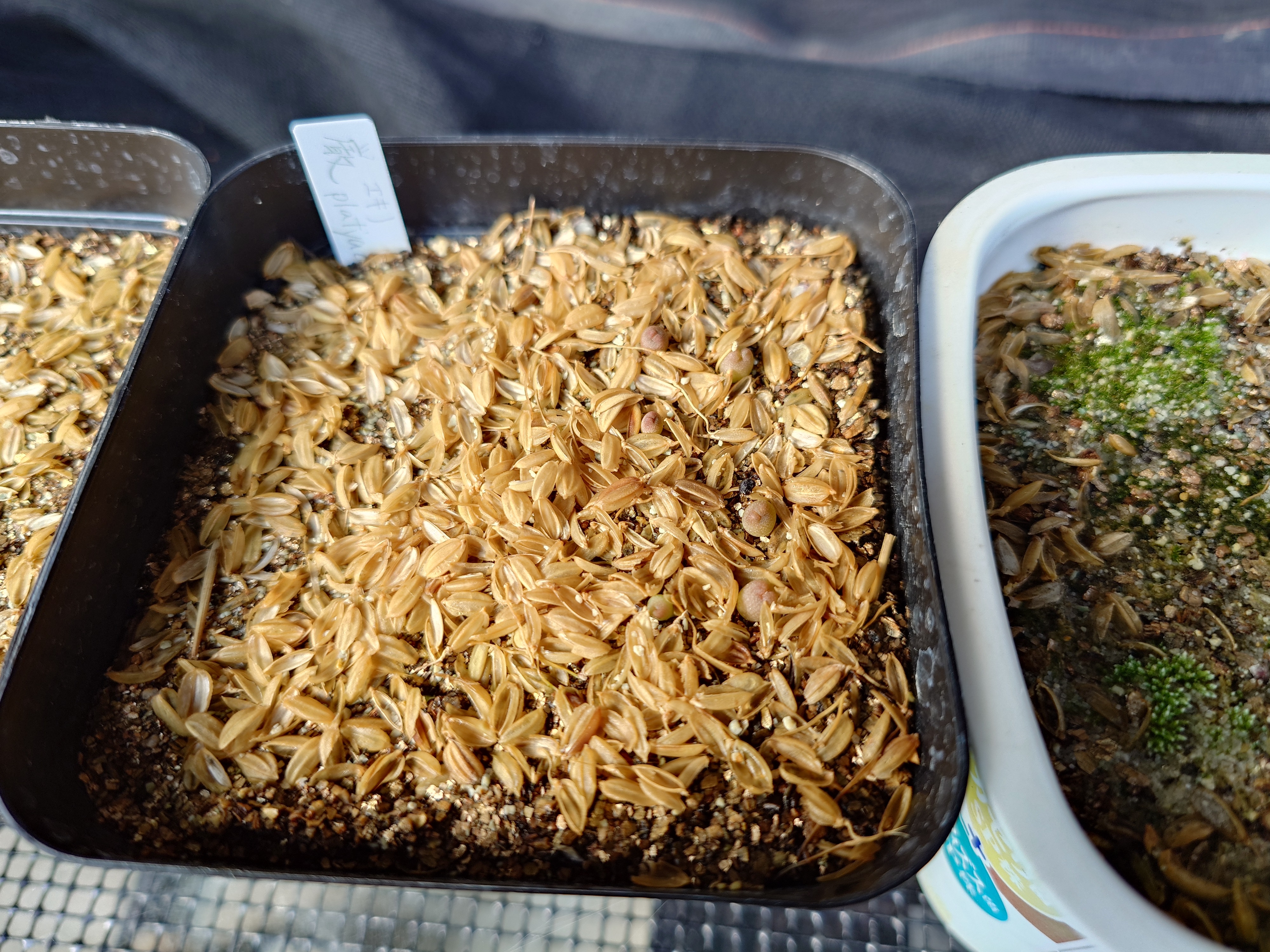 ・播種した種は、 バーミキュライトで薄く覆土し、籾殻や糠を軽く撒いたり撒かなかったり。