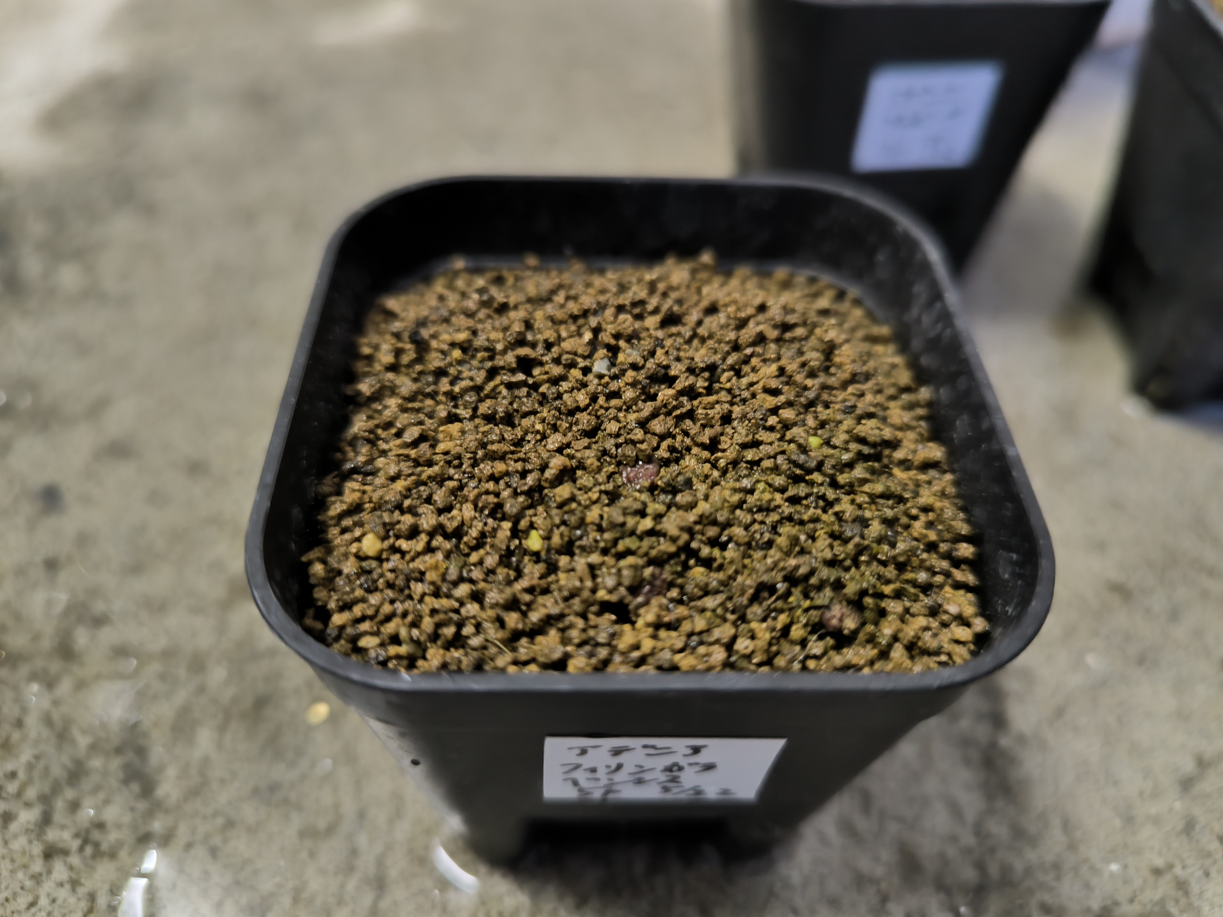 プレステラに培養土(軽石、赤玉、鹿沼)を2/3程入れ、残り1/3に芝の目土(赤玉細粒の代わり)を入れた上に播種。