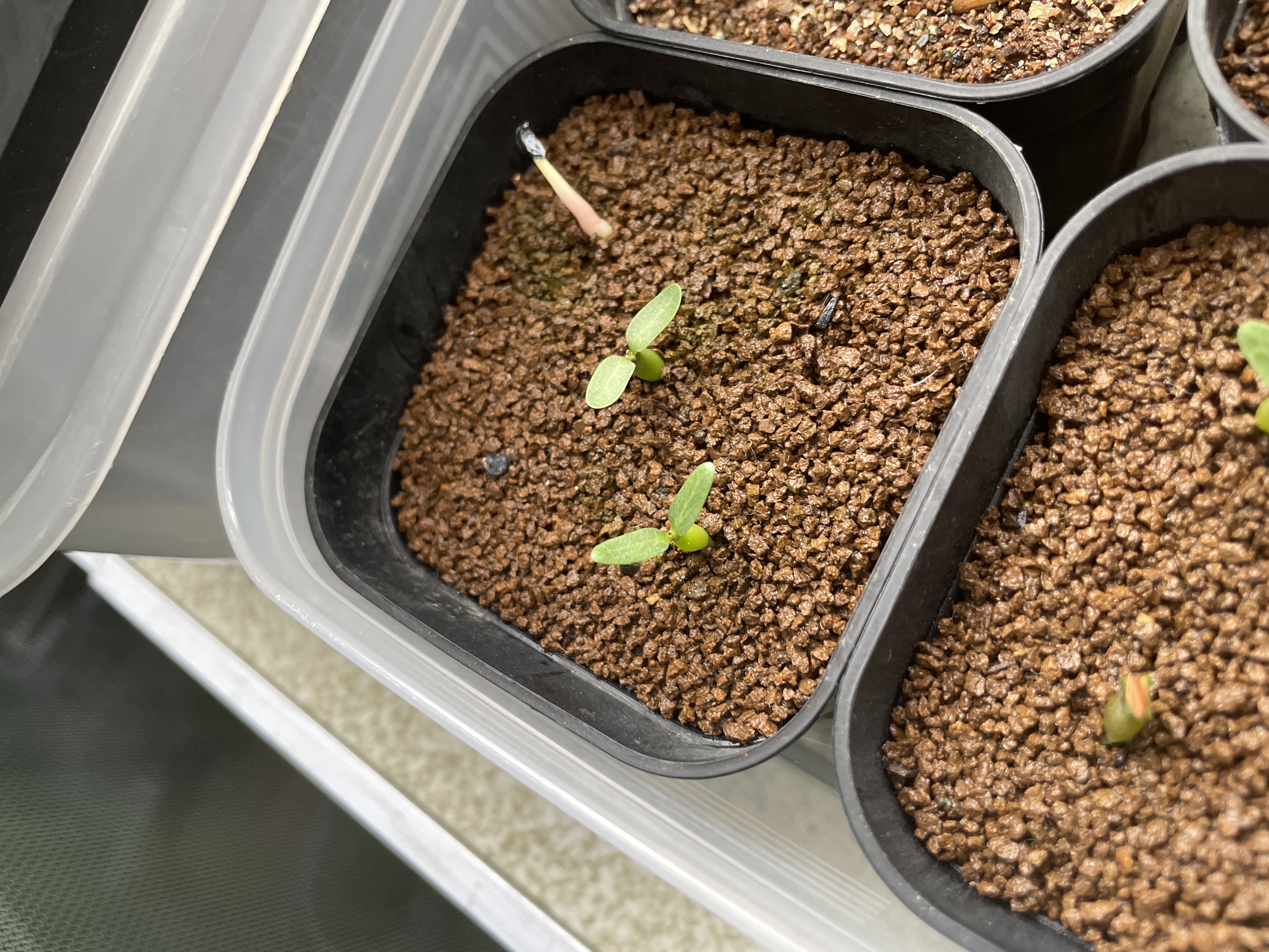 発芽数:2粒[ その他(用土や管理方法など)]播種前にメネデール+ベンレート溶液に1日浸漬プレステラ90の下半分を赤玉小粒+軽石、上半分を赤玉細粒の用土に播種。屋根下で腰水管理。11粒はカビで終了。2日程度で発芽。