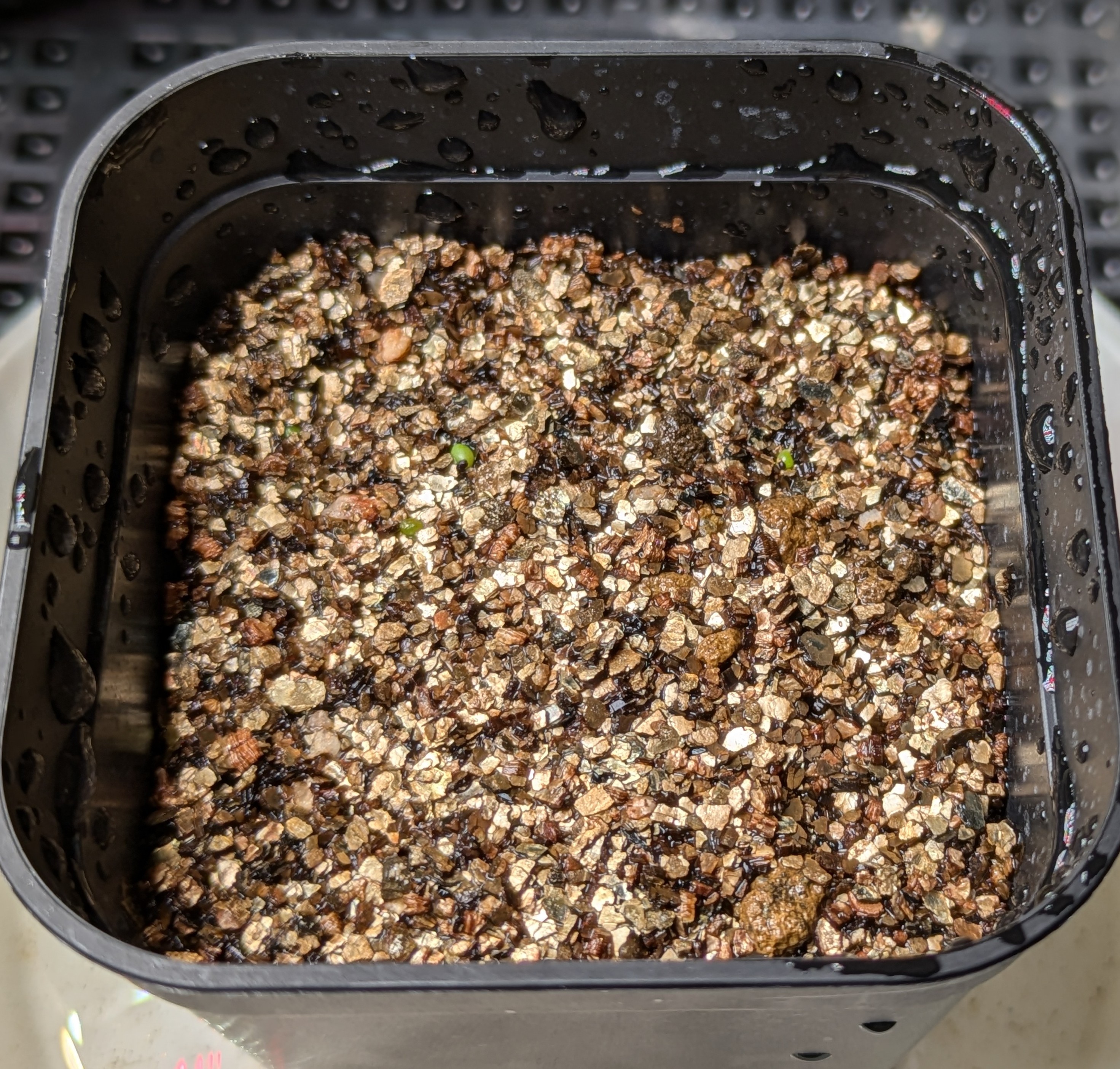 ハダニとどっこいぐらいの小さい種子なのでどのあたりにどれくらい蒔いたか分からなくなりました。最初の発芽は5月中旬に3つ確認。先日新たに1つ確認できました。現在は屋内、LEDのもとで育成しています。