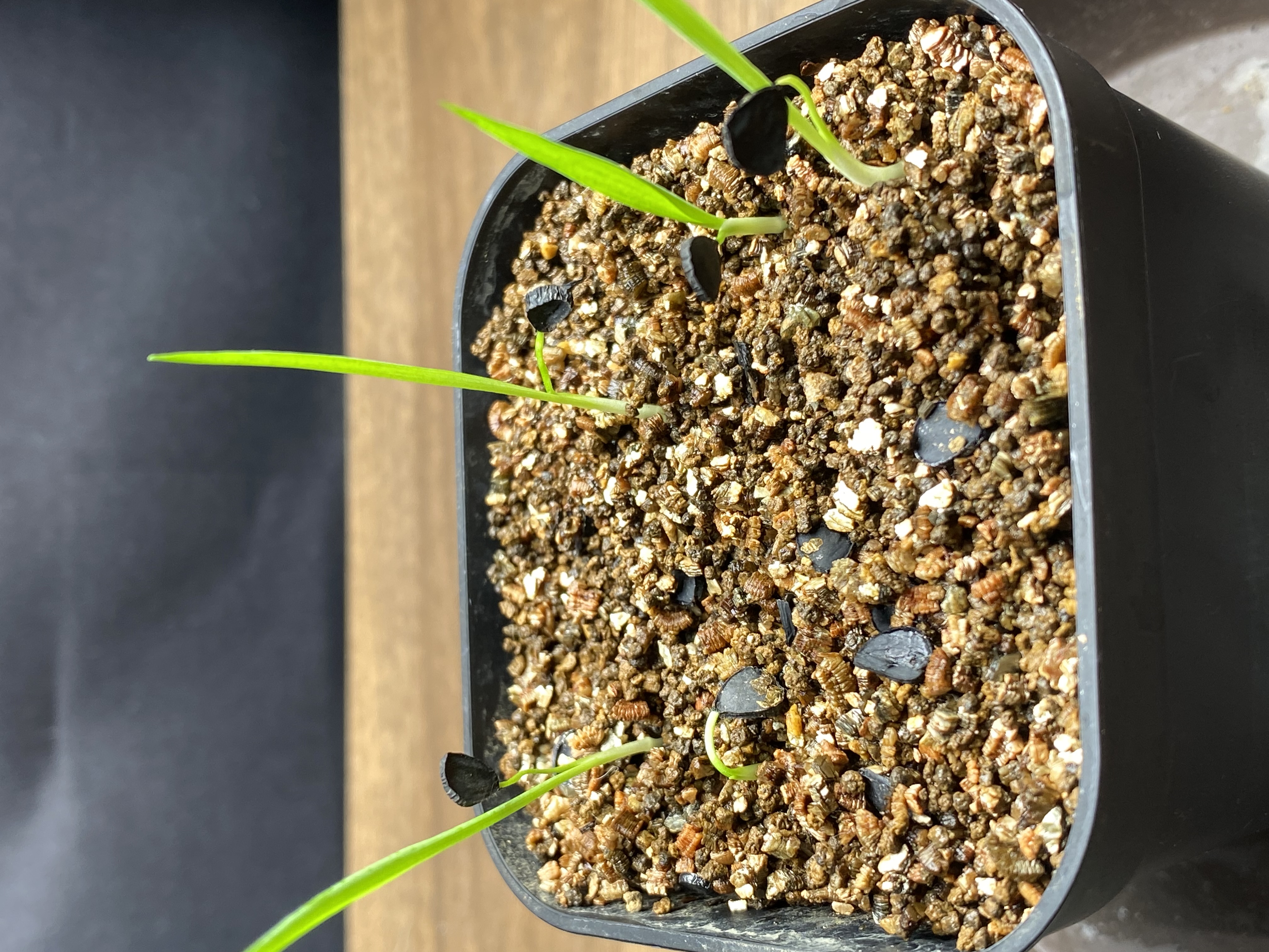 最初は播種10日後に一つ発芽。そこからぽつぽつと発芽して、播種26日後に5個目が発芽しました。播種18日後以降は密閉管理を止めて、腰水+朝晩の霧吹きで湿らせるに変更しましたが3つ発芽しています。