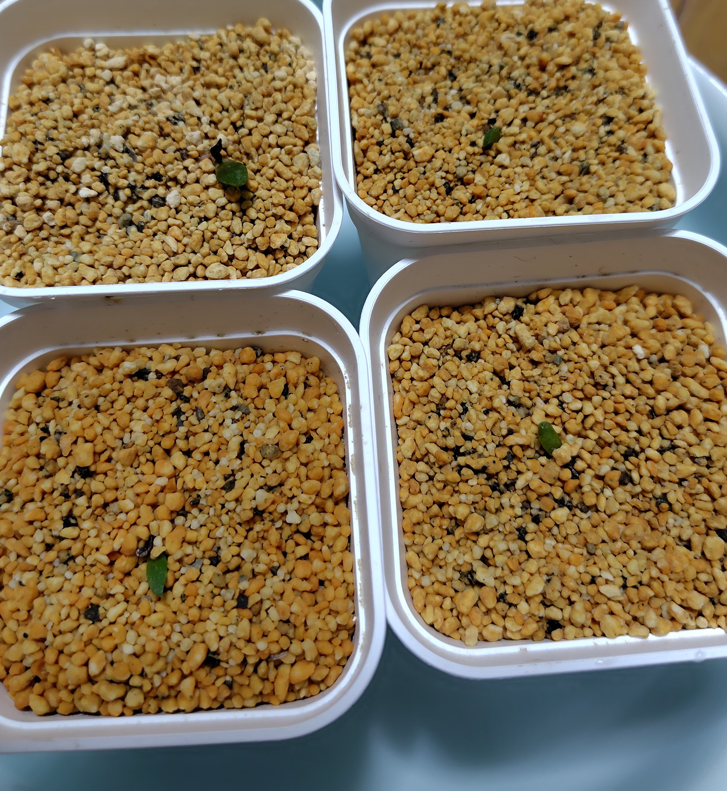 ベンレート&メネデール溶液に24時間程浸漬後、軽石・赤玉・鹿沼土に播種。同じ溶液で腰水して発芽後は腰水やめて霧吹きのみ。ゆっくり生長していて可愛いです。