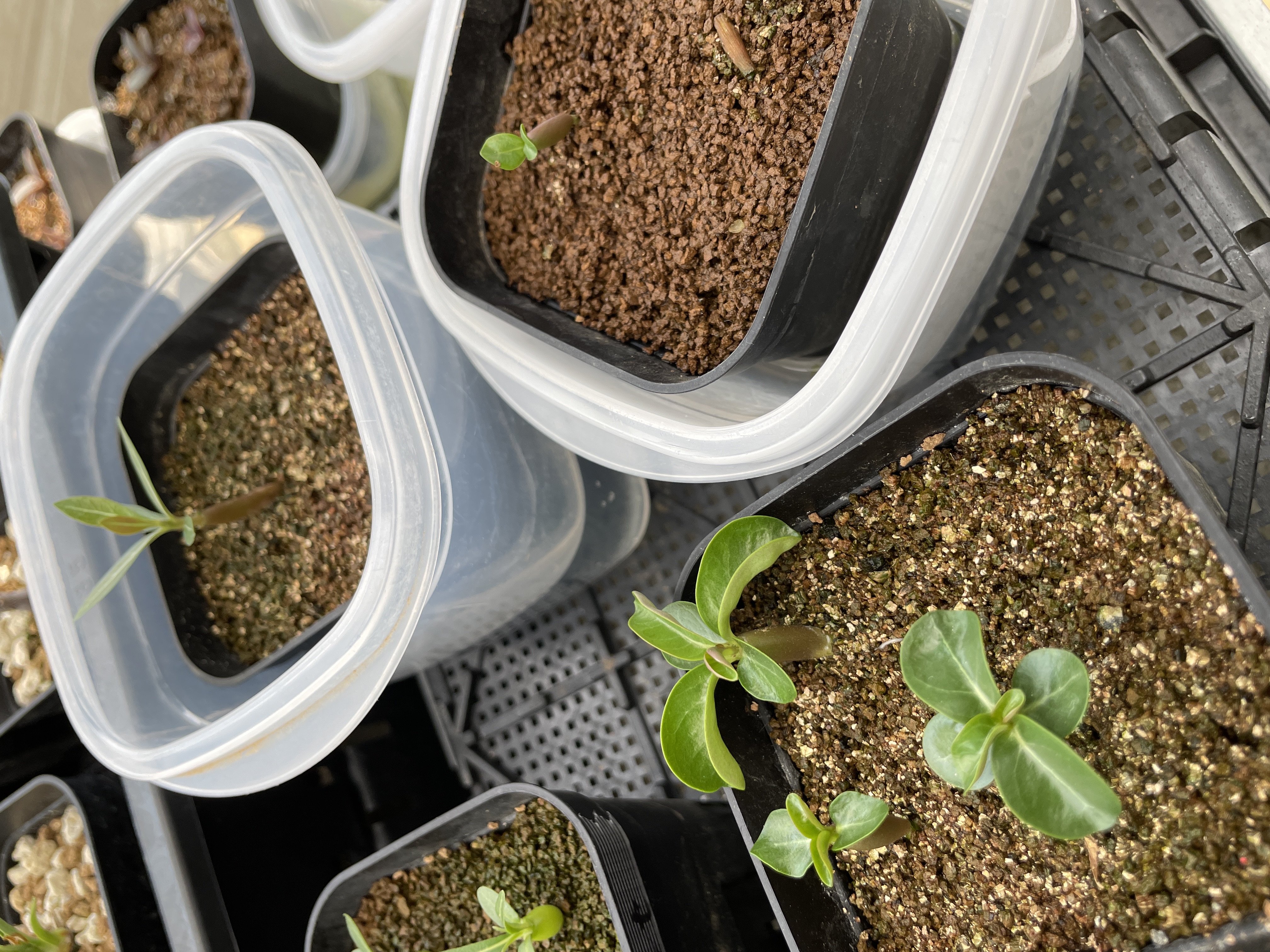 種子が水分を吸ってふっくらしたもの4粒をプレステラ90の下半分を赤玉小粒+軽石、上半分を赤玉細粒+バーミキュライトの用土に播種。残り2粒はプレステラ90の下半分を赤玉小粒+軽石、上半分を赤玉細粒の用土に播種。屋根下で腰水管理。最初の4粒はすぐに根が出た。残り2粒は動きが鈍いが一つは成長してきた。