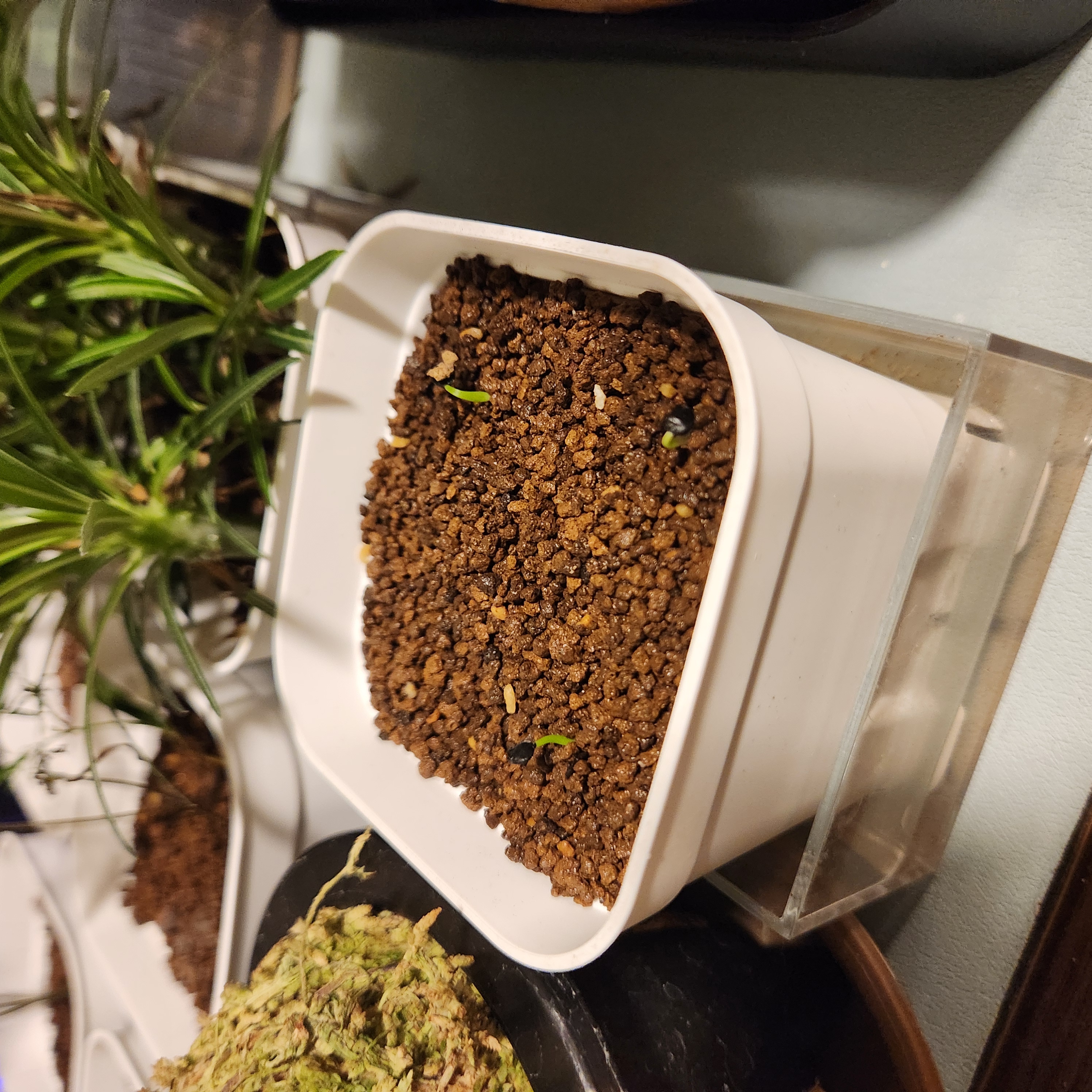 赤玉細粒2+鹿沼細粒1の用土に播種後うっすら赤玉細粒を被せメネデール+木酢希釈水で室内腰水管理