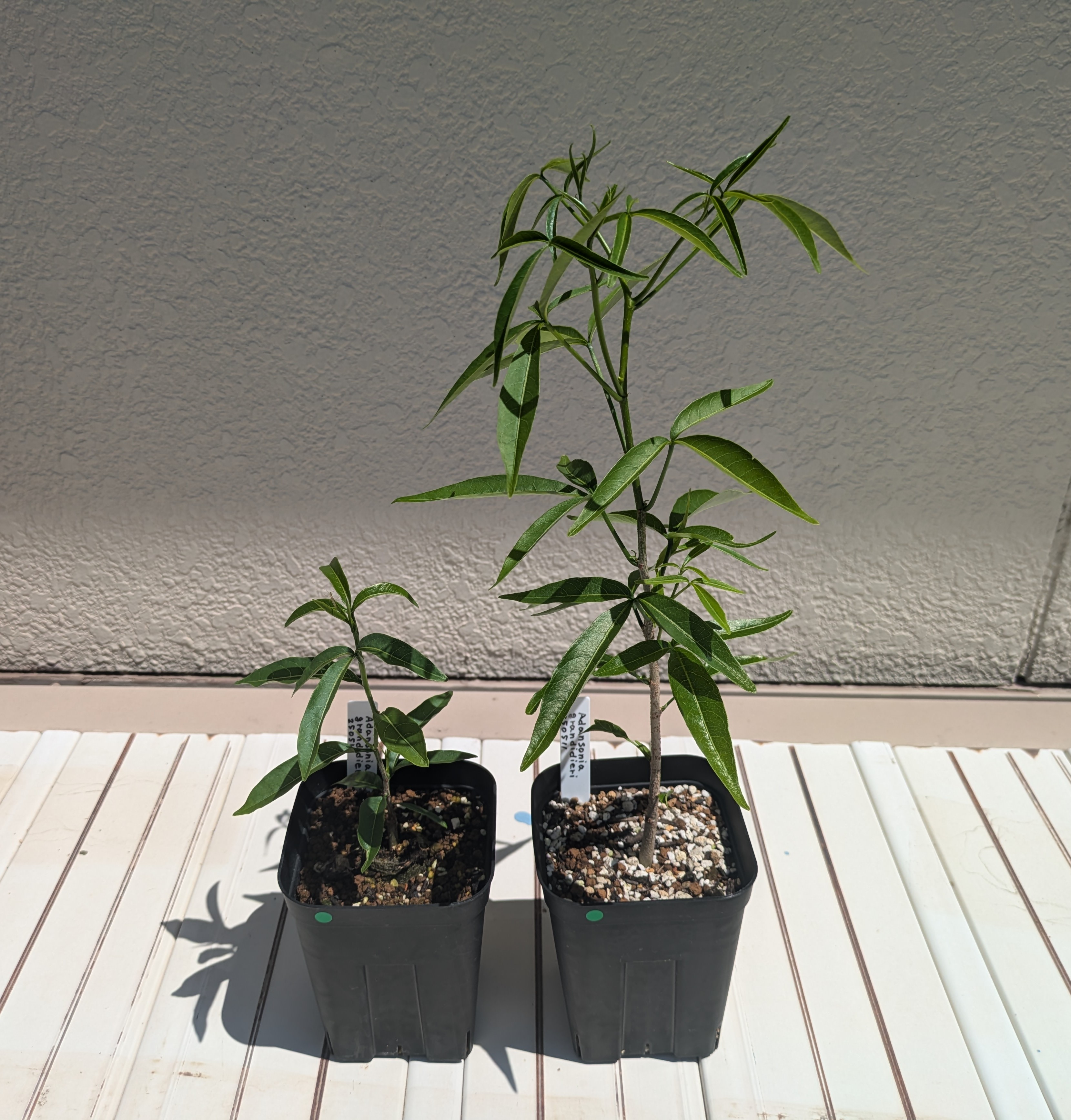 私の種皮処理が雑であり、さらに播種時期が早すぎたので多くは腐敗。夜間20℃を下回る時期の外蒔きはギャンブル。左株は種から子葉が展開できず、先に本葉がパワーで種皮を突き破って出てきたので伸長低めです。
