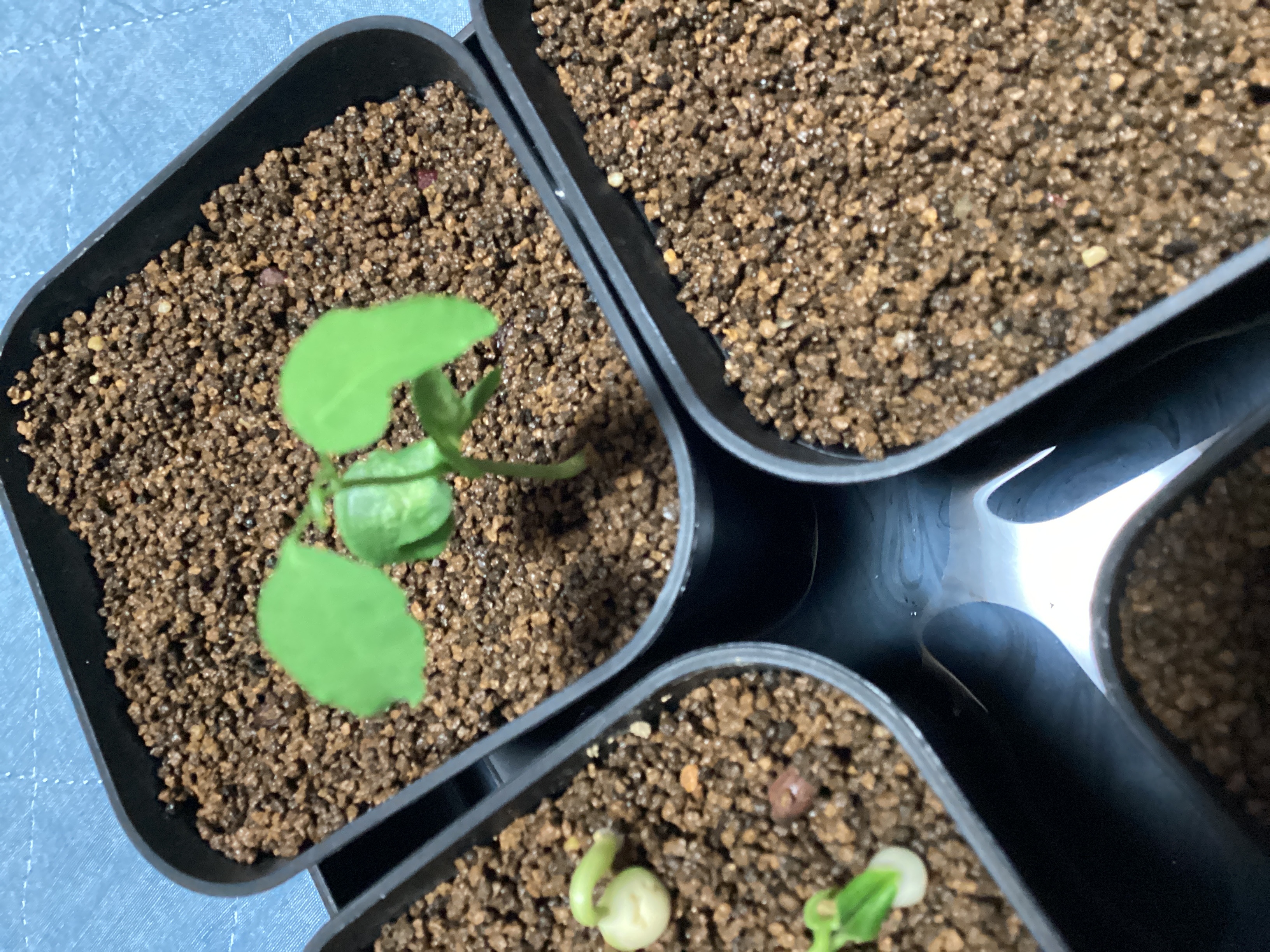 メネデール+ベンレート液に24時間漬け、果肉を歯ブラシで取り除いてから殺菌した赤玉に播種