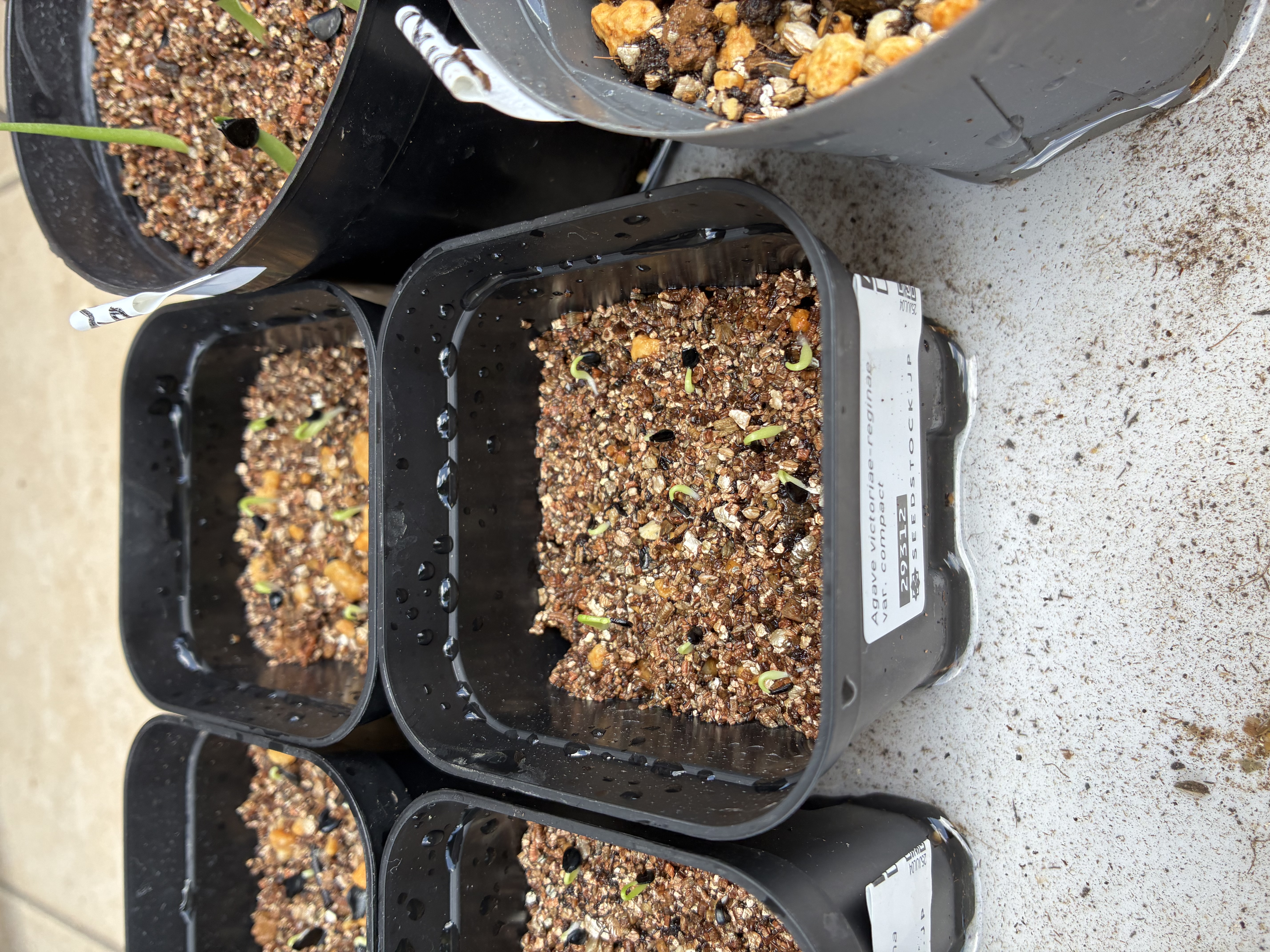 観葉植物用培養土:1+赤玉:1鹿沼土:1にバーミキュライトを敷き播種、遮光ネット内で腰水管理。