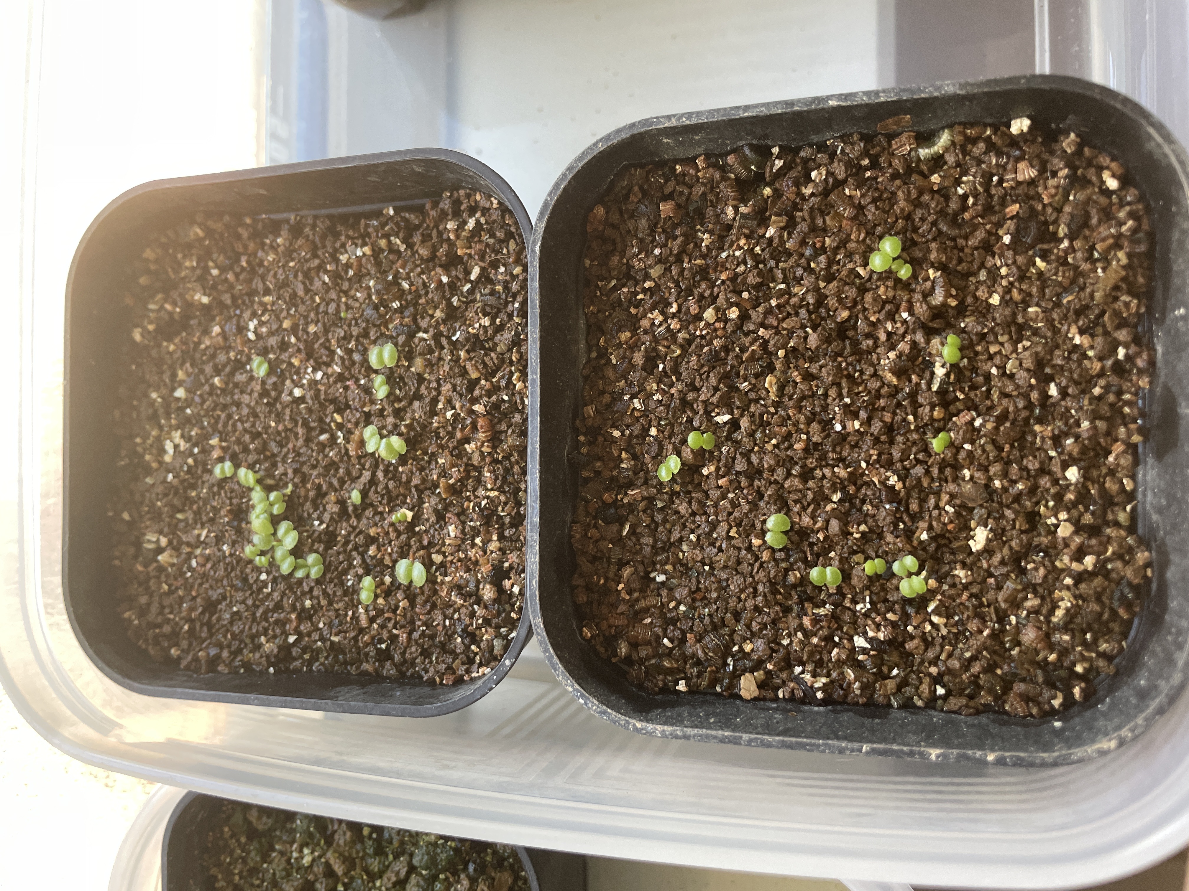 発芽数:30粒[ その他(用土や管理方法など)]プレステラ90の下半分を赤玉小粒+軽石、上半分を赤玉細粒とバーミキュライトの用土に播種。屋根下で腰水管理していましたが、30℃超えは厳しいと考え室内27℃窓際へ移動。1週間程度で発芽。