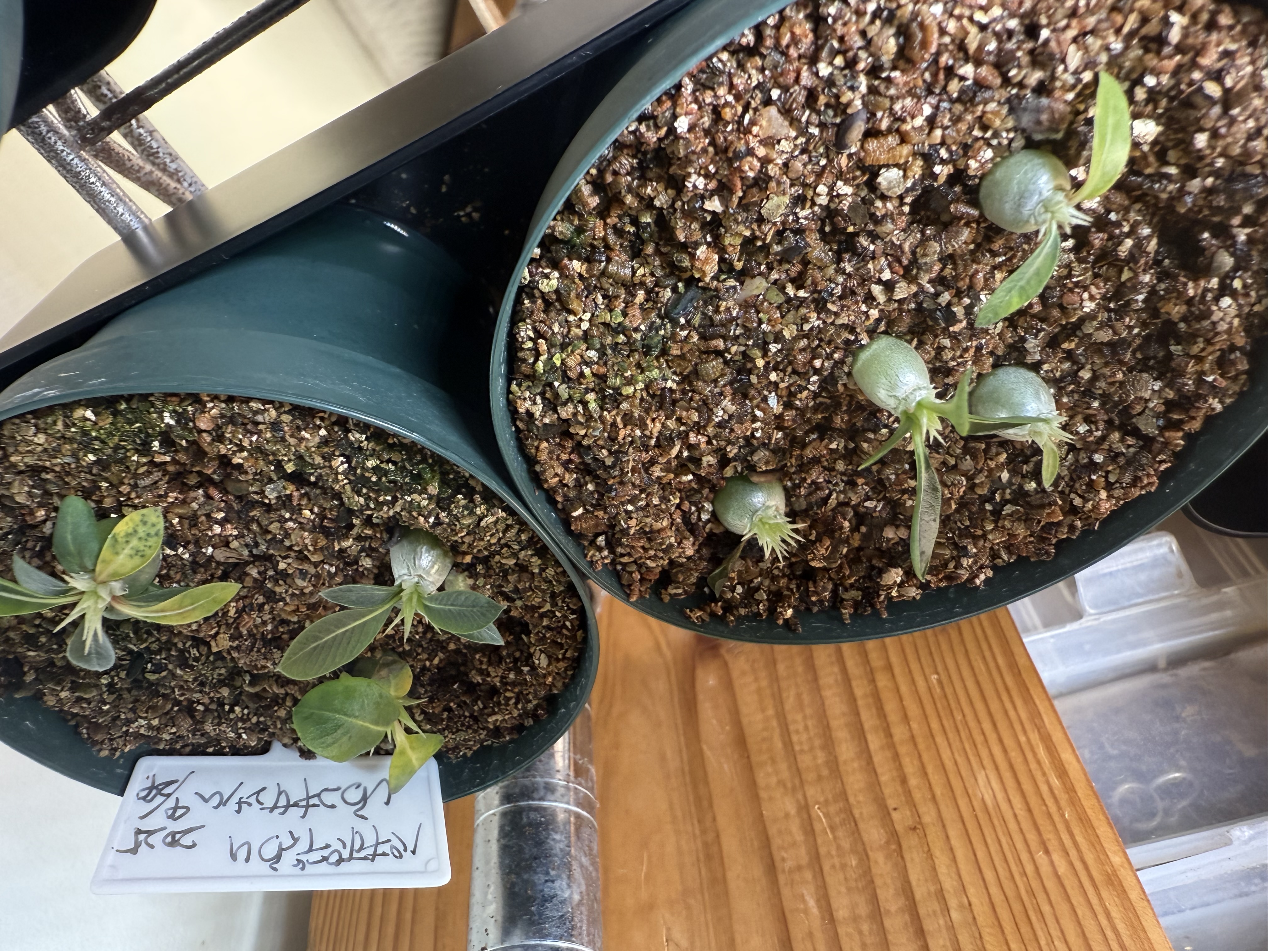 [ 播種日 / 撮影日 ] 2025/4/24播種 2025/8/5撮影[ 播種数 / 発芽数 ]11粒/ 11粒[ その他(用土や管理方法など)]播種前にベンレート+メネデール溶液に12時間程度浸漬赤玉、鹿沼メインの用土に細目のバーミキュライトを敷き播種、25〜30度の腰水管理