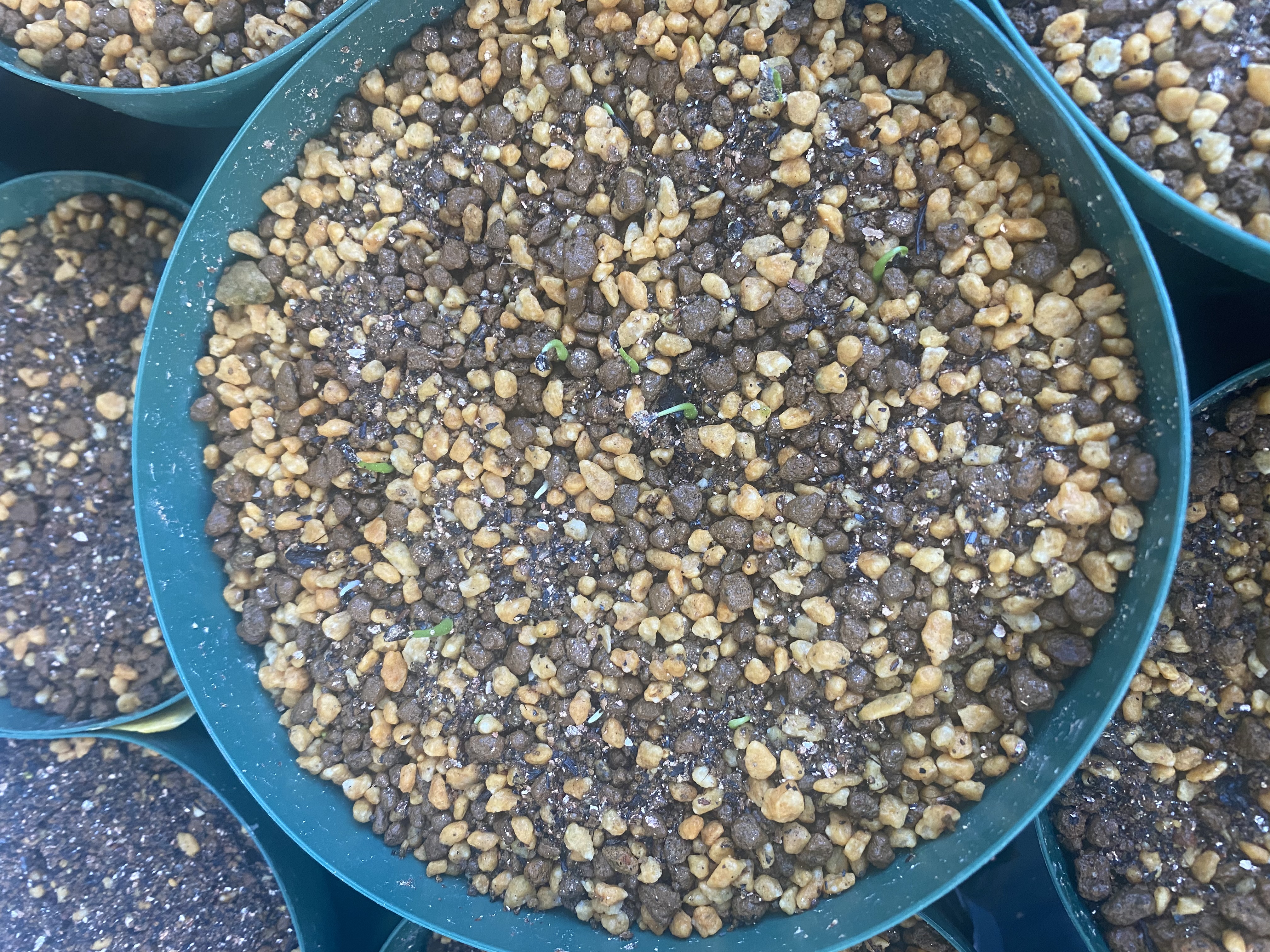 赤玉、鹿沼、腐葉土、ボラ土メインの用土に赤玉と鹿沼の小さめの土を敷きさらに振るいにかけた細かい用土をその上に被せて腰水管理で午前中は太陽が当たる外で管理すると2日目ぐらいから続々と発芽し始めましたー