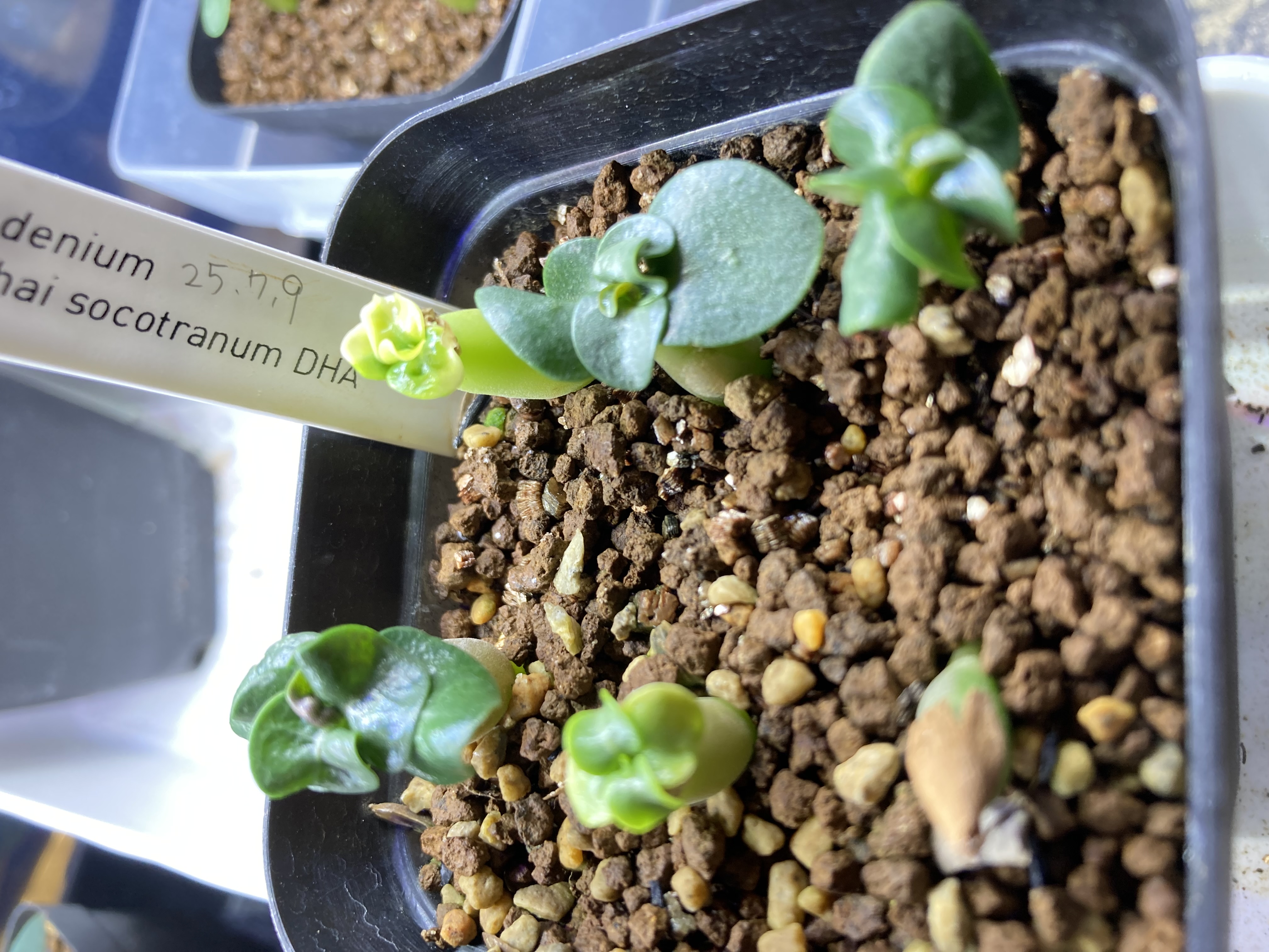 播種前にベンレート+メネデール溶液に1日程度浸漬コーデックス用土の上に赤玉メインの用土に細目のバーミキュライトを敷き播種、27〜31度で室内管理