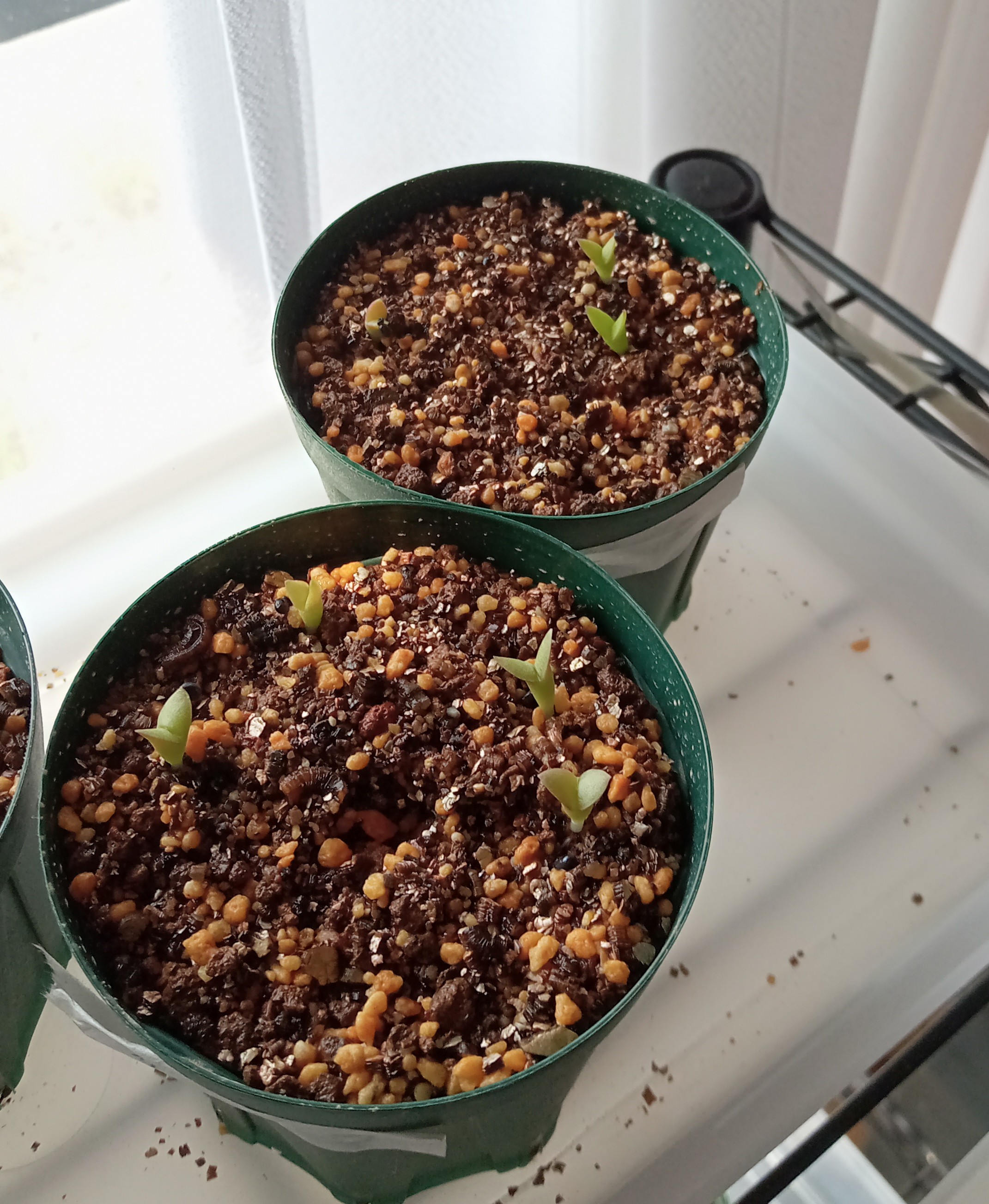 赤玉小粒、鹿沼土小粒、バーミキュライトの混合土に播種。メネデール溶液にて腰水。