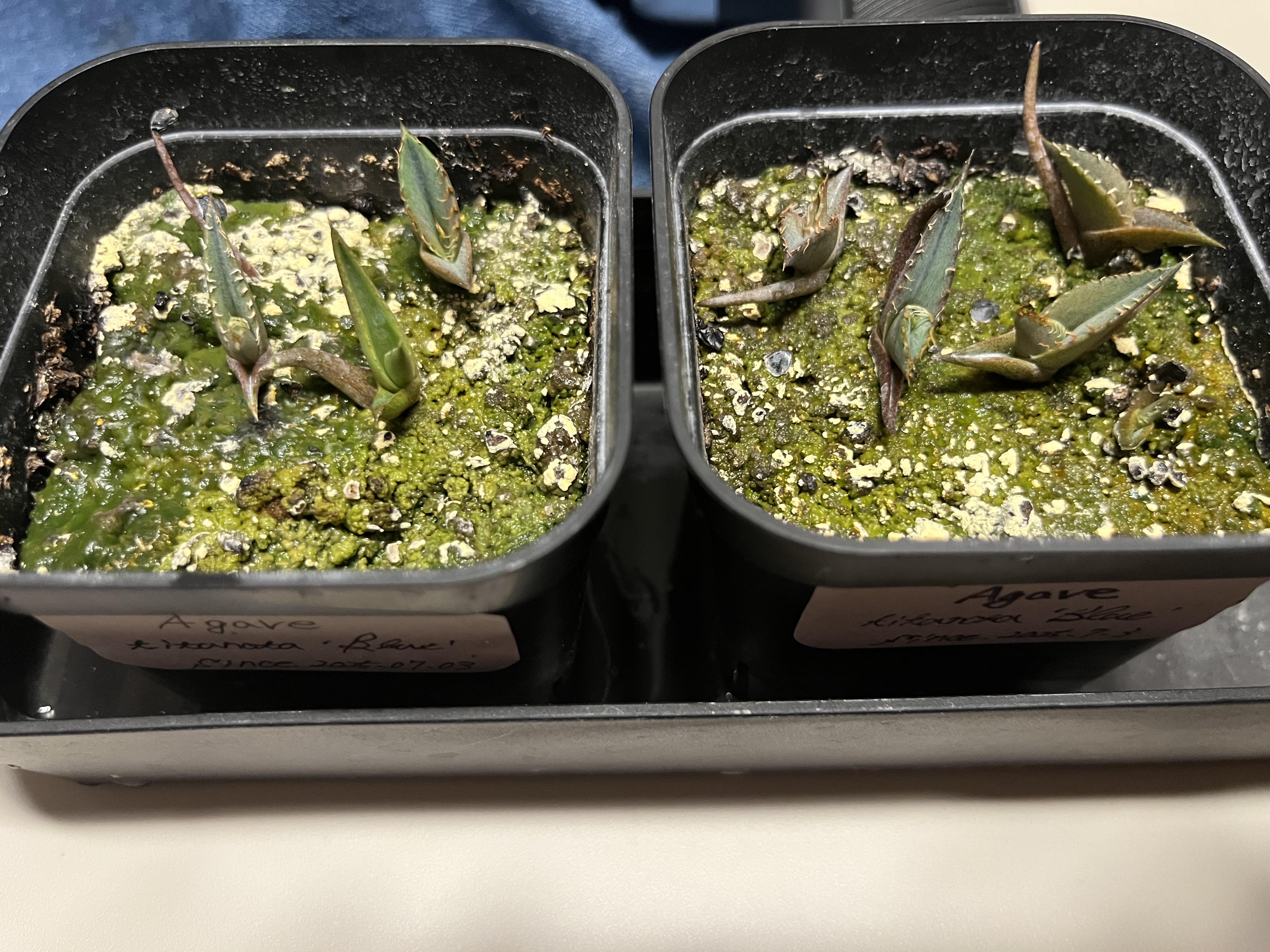 リキダスを加えると成長が早く感じるが、土表面に栄養素が付着し土が白化&苔(問題なく成長してます)