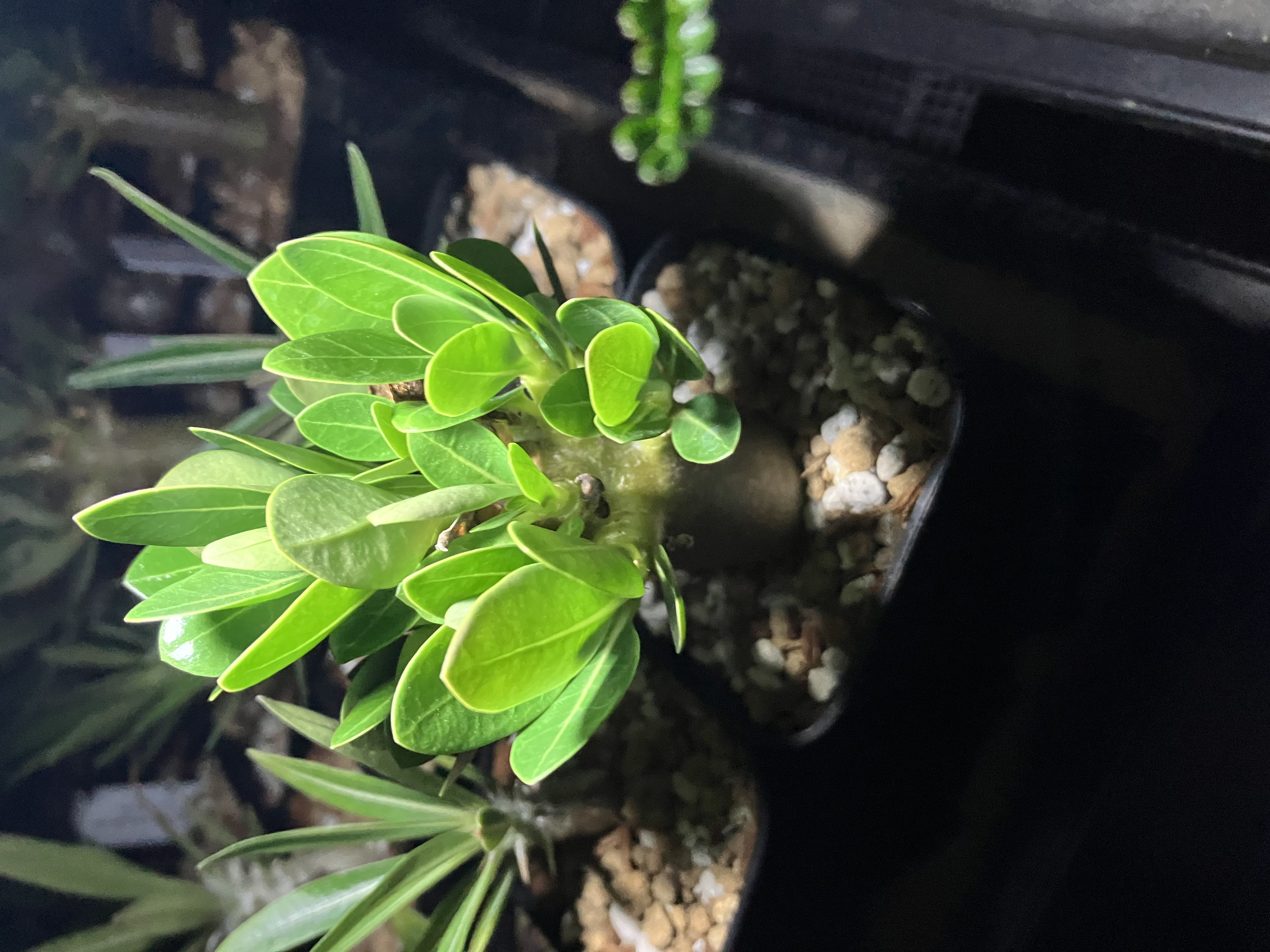 赤玉小粒と軽石小粒を混ぜた用土の上に種を置き、腰水で25〜30度で湿度100%管理。幼苗の時に成長点を切ったのでわさわさに育ってます。
