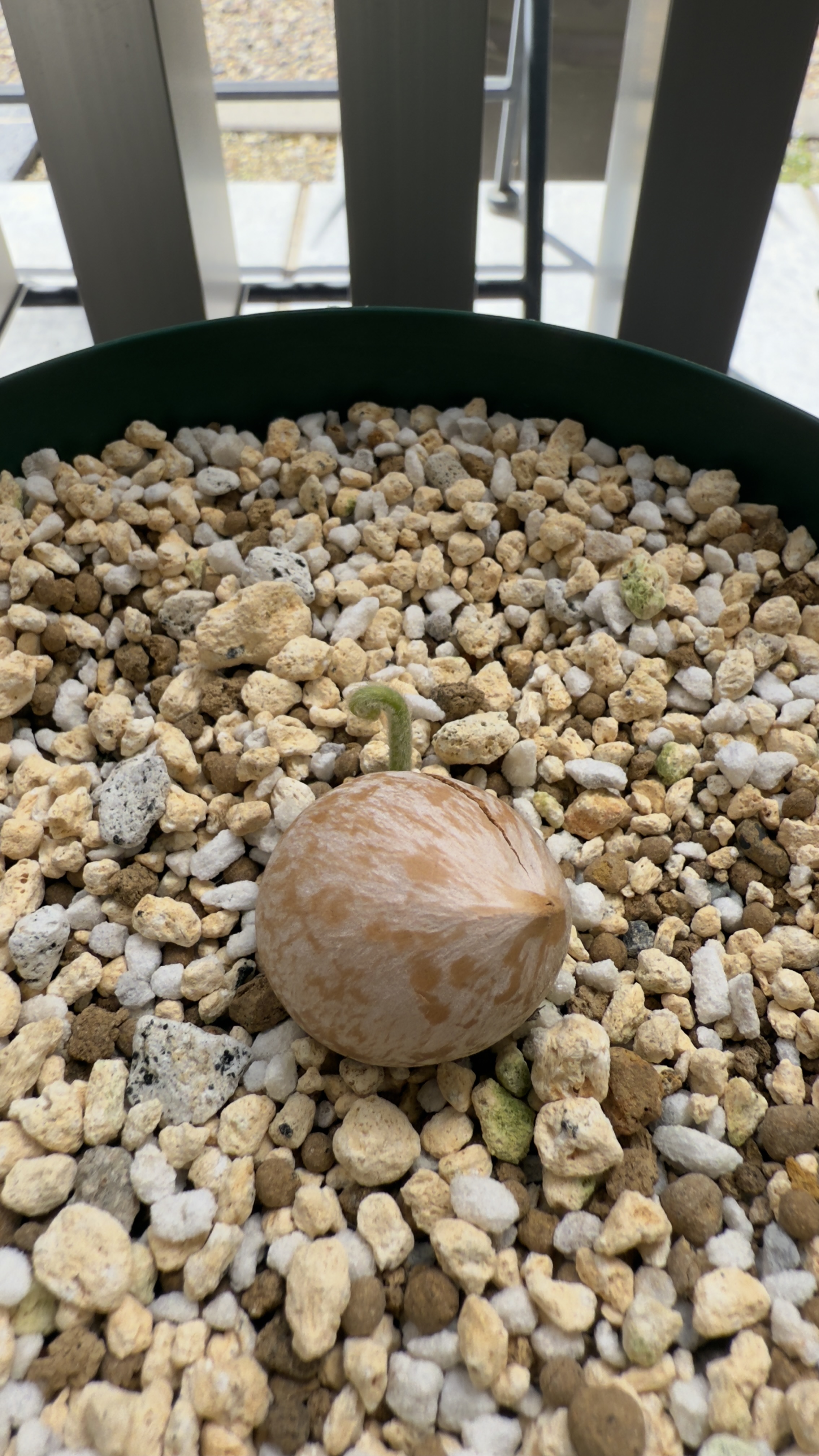 発根までは正直簡単でした。それから発芽するまでが長かった、、、外の半日陰の場所に4ヶ月やっと発芽しました。週に2回程土が乾いたら水やり。動きがないので半分諦めていたがやっと発芽しました。