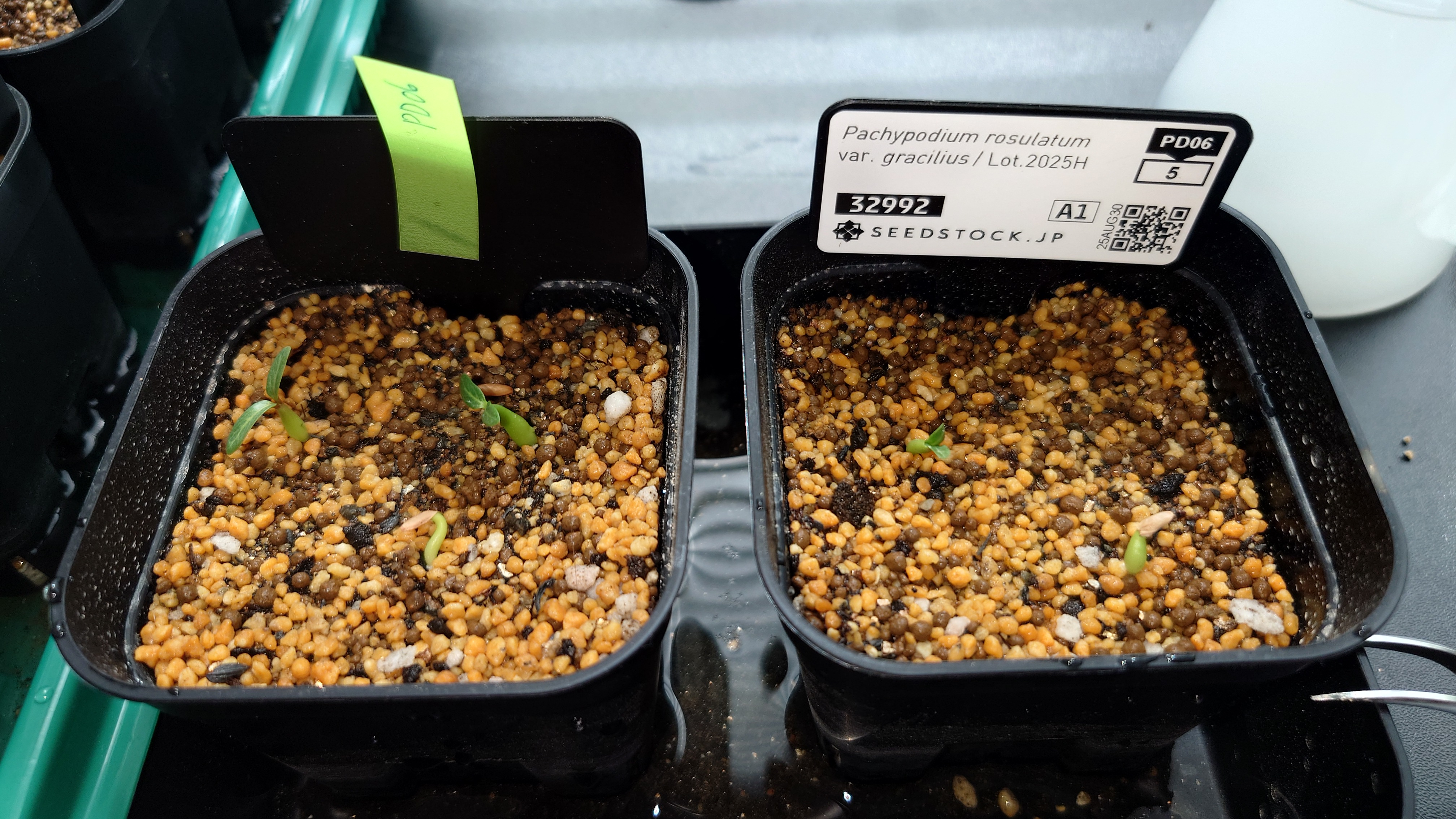 覆土なしで腰水及び蓋及び育成ライト付きの育苗ポット内に入れて室温26℃で管理