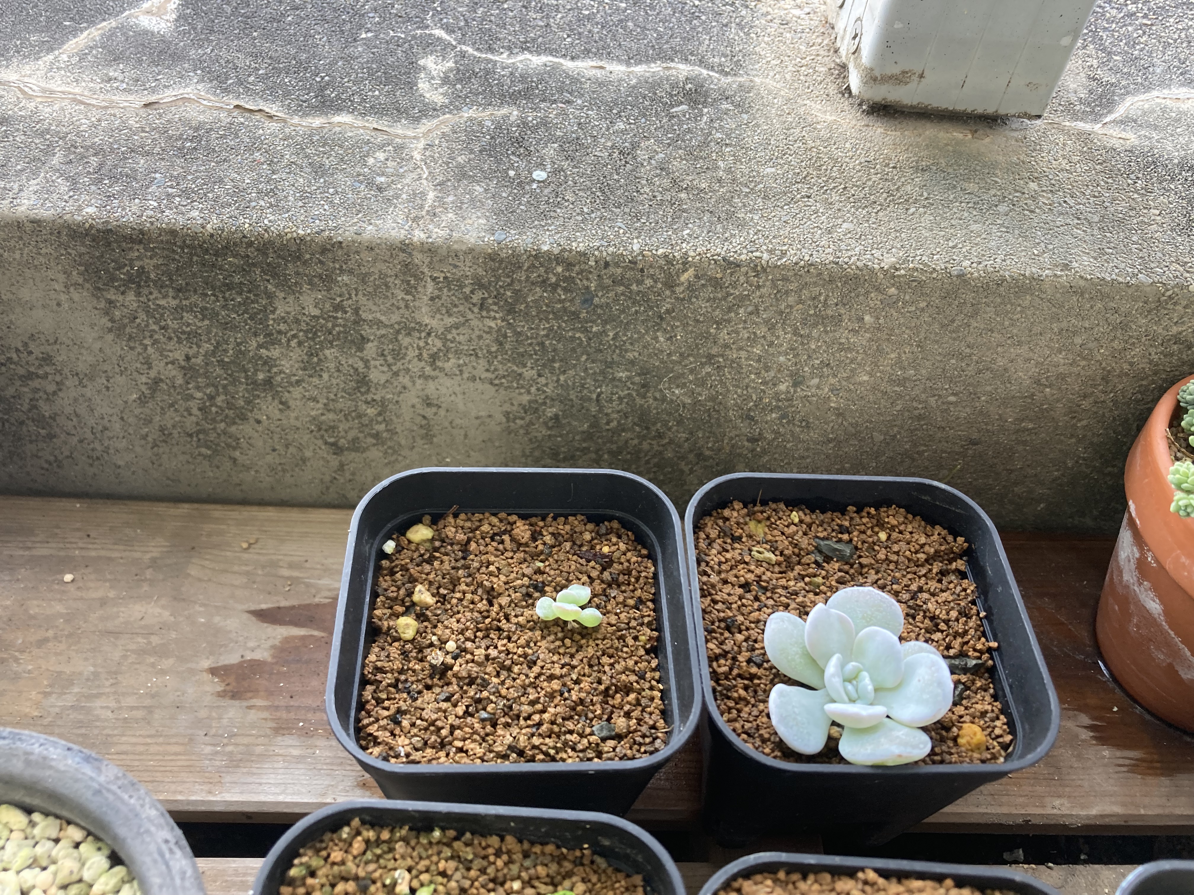 202/1/12播種 2025/9/27撮影[ 播種数 / 発芽数 ]20粒強/ 14粒,夏越しできたのは2株.タッパーに多肉植物の土(DCM),表面に芝の目土,種は事前に水漬けせず表層に播種.