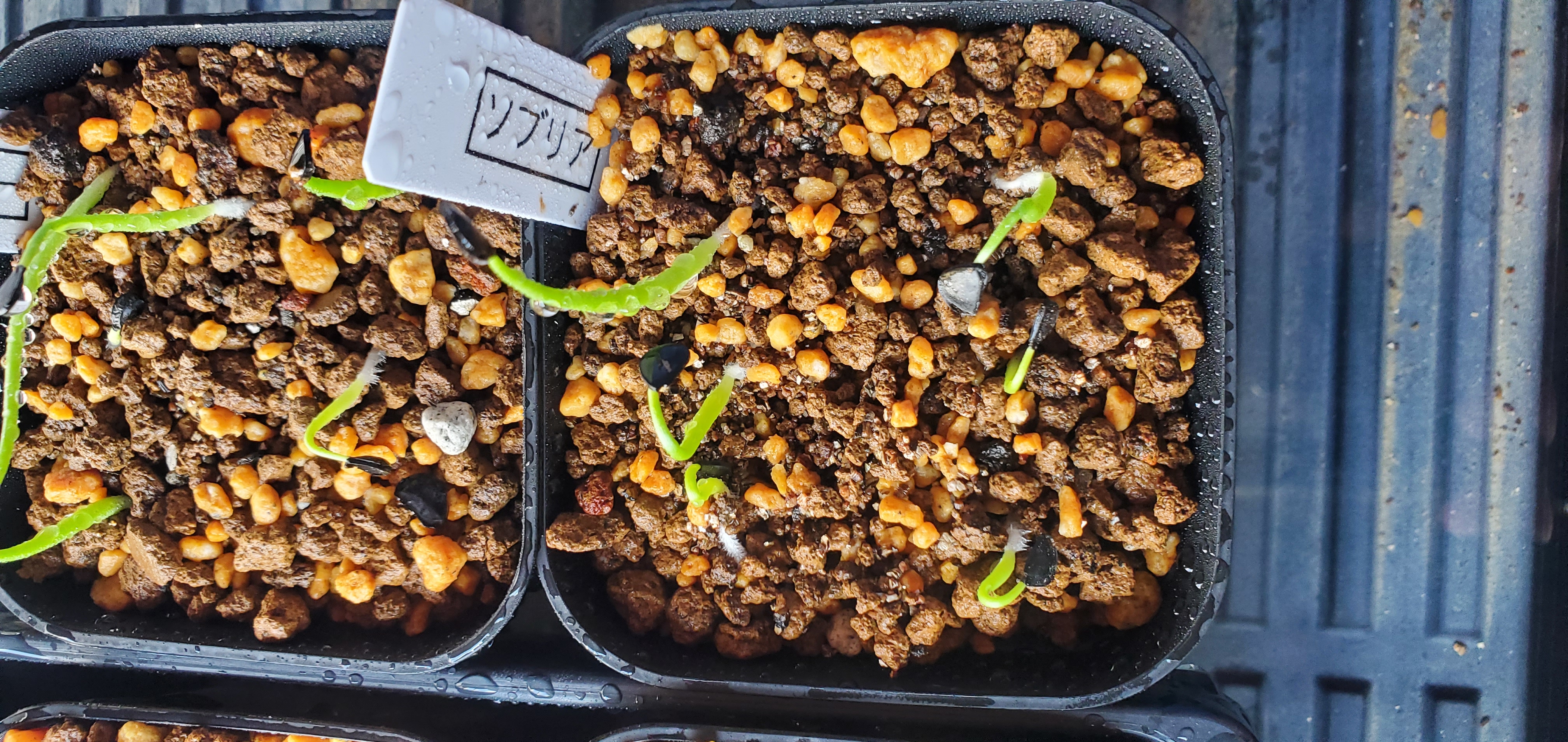 赤玉土3×バーミキュライト2×鹿沼土1に播種、ガラス越し、20度〜25度で腰水と霧吹きで管理
