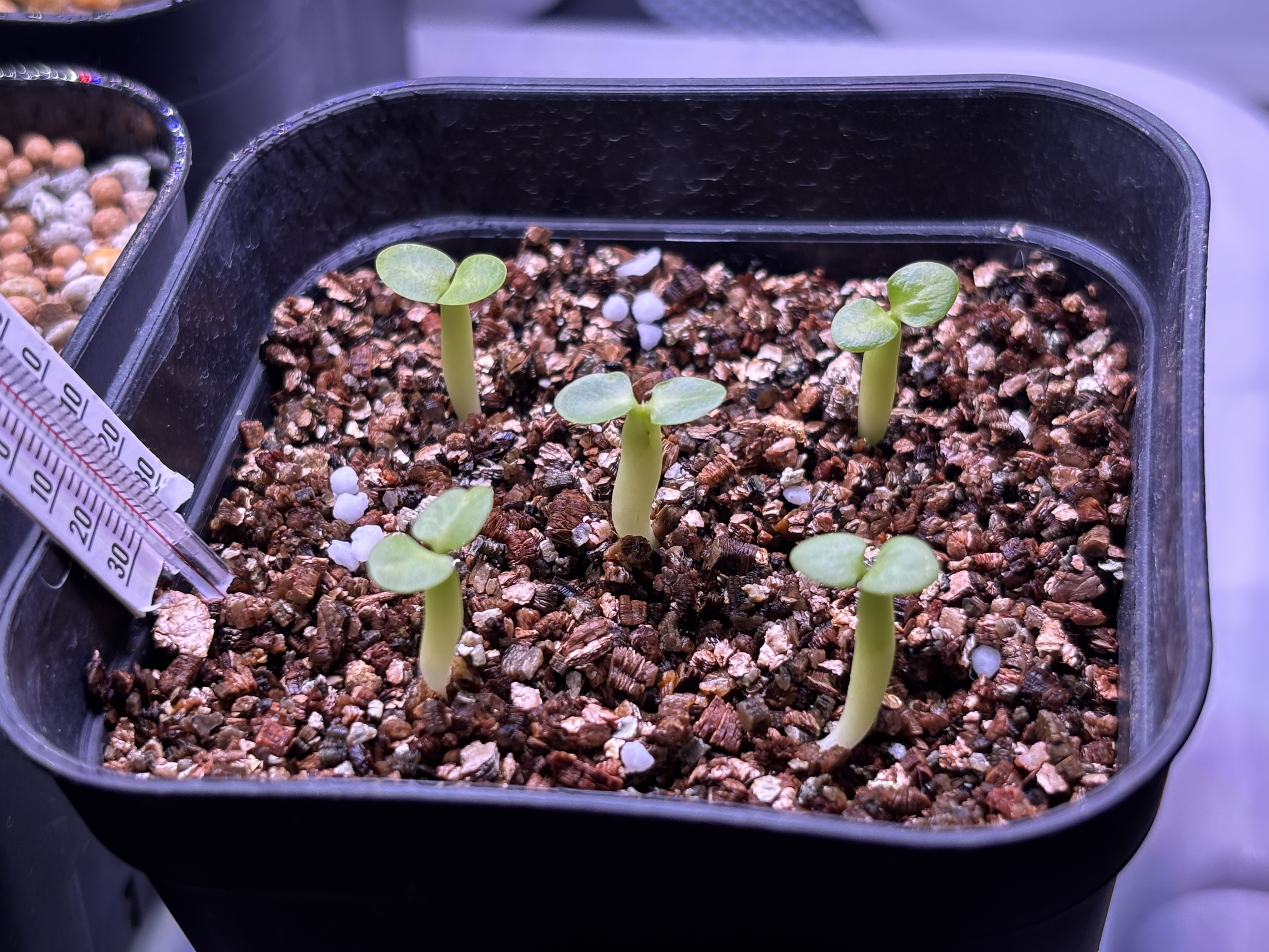 先の溶液で腰水管理していたが、他に播種したものに合わせ30℃にしていたところまた溶けてしまい、半分ほどしか残らなかった。手を掛けすぎてダメにしてしまった、まさに種からしたらありがた迷惑だろう。無念。この5苗を大切にします。