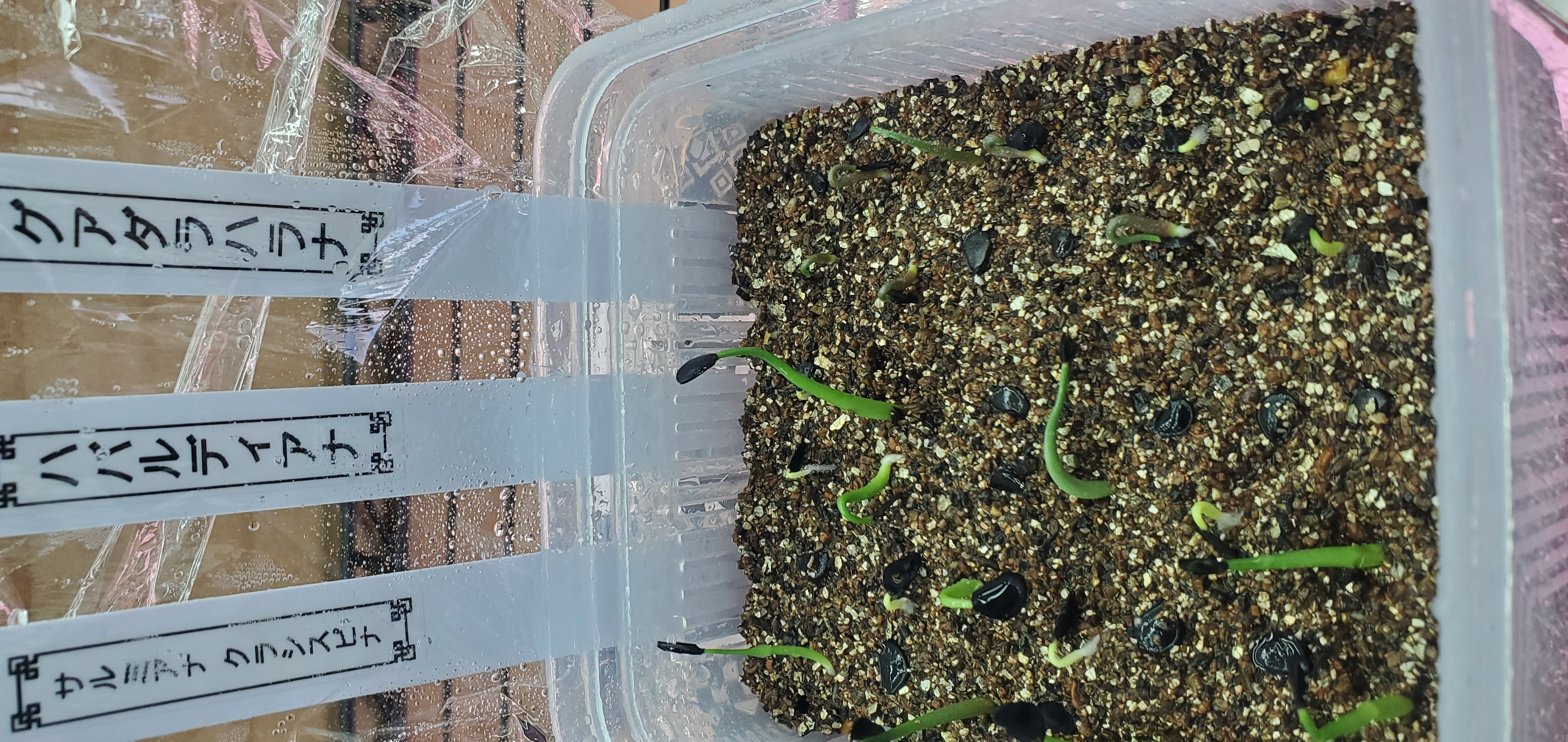 赤玉、鹿沼土、軽石の用土にバーミキュライトを敷き播種、室内で育成ライトとヒーターマットを使用し20度〜25度で管理