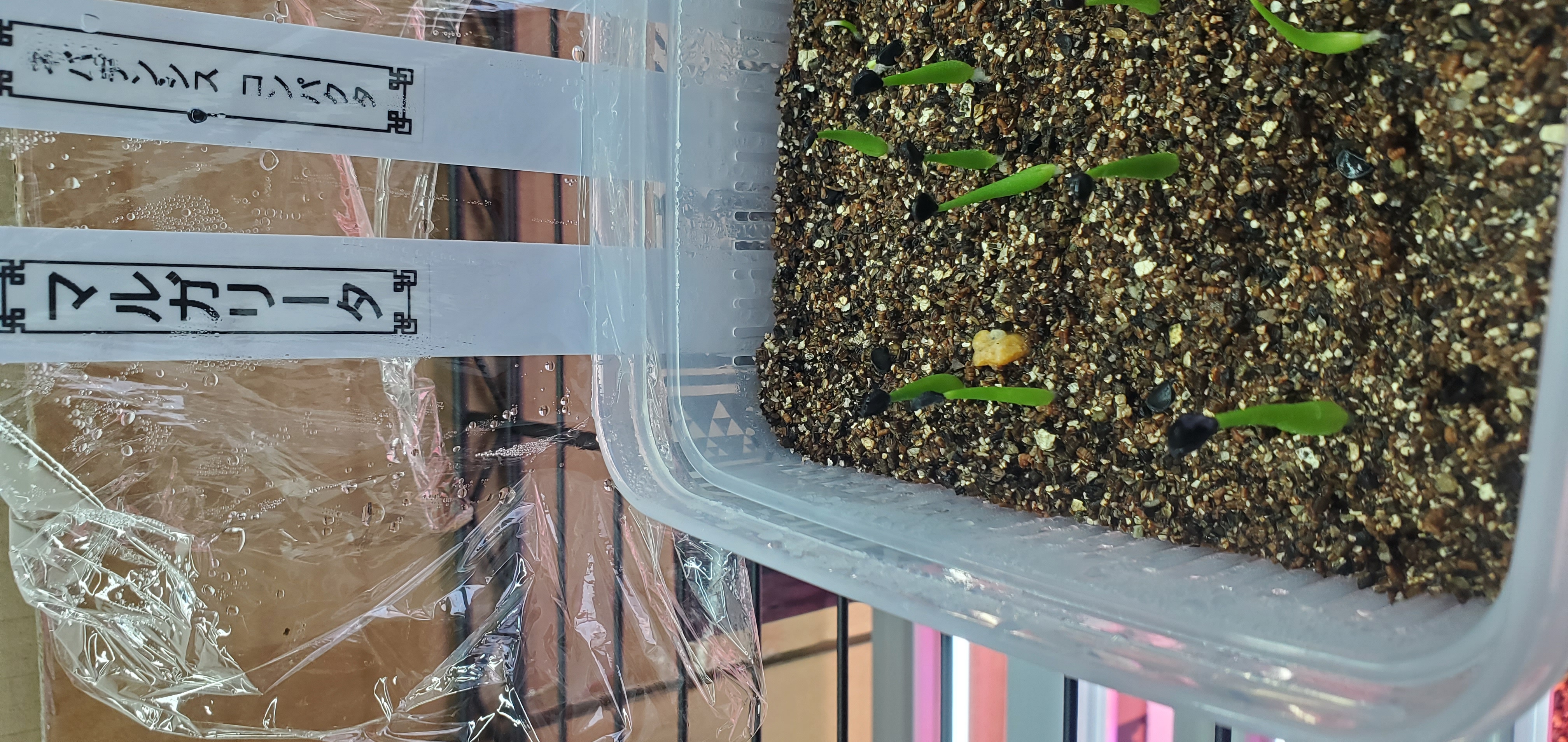 [ 播種日 / 撮影日 ]2025/10/18播種 2025/10/27撮影[ 播種数 / 発芽数 ]6粒/ 3粒[ その他(用土や管理方法など)]播種前にベンレート+メネデール溶液に1日程度浸漬赤玉、鹿沼土、軽石の用土にバーミキュライトを敷き播種、室内で育成ライトとヒーターマットを使用し20度〜25度で管理