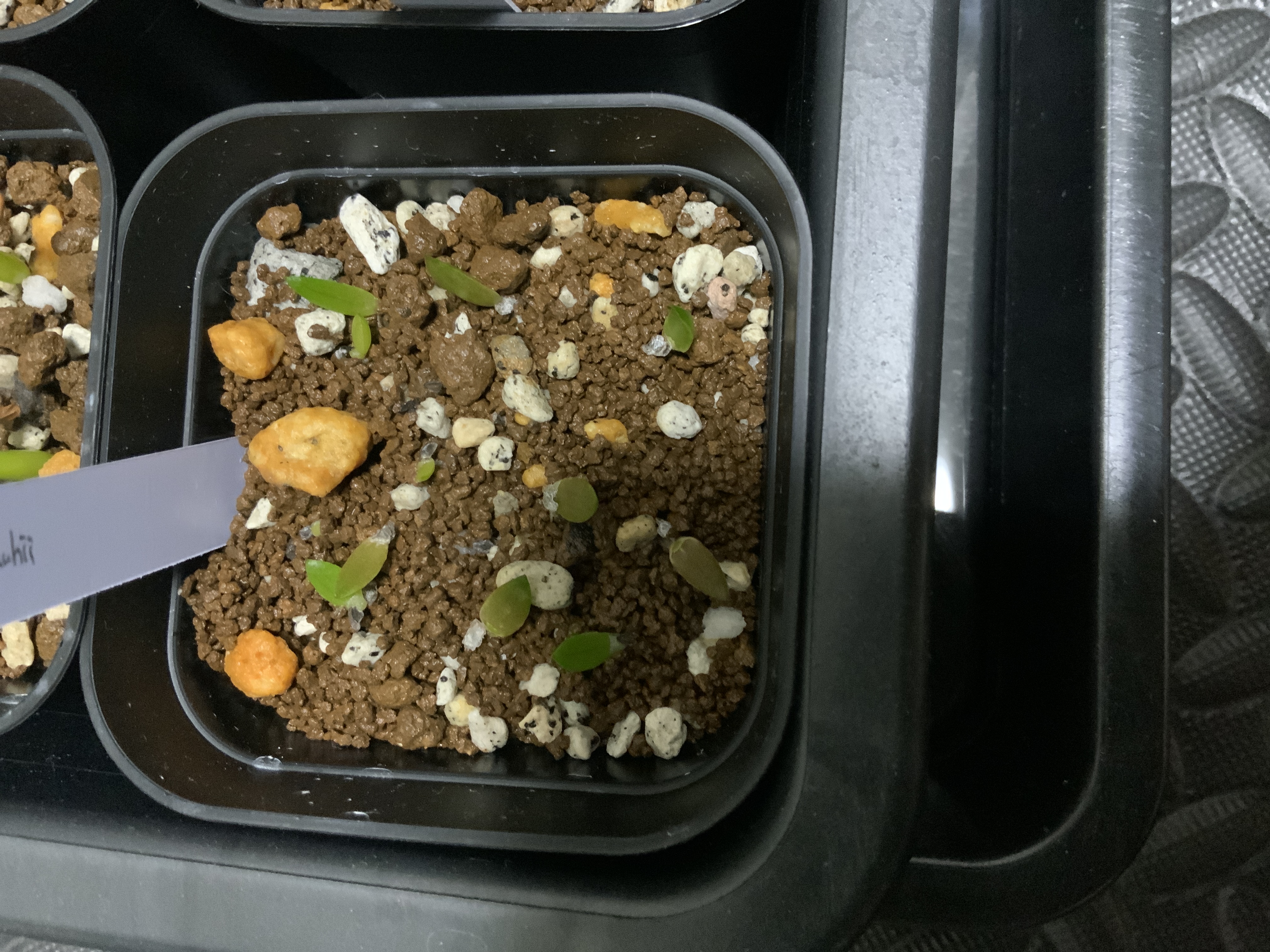 1週間程度加湿環境で管理した後、室内(湿度50%程度)で育成中ですが、常湿管理移行後も発芽し続けています。