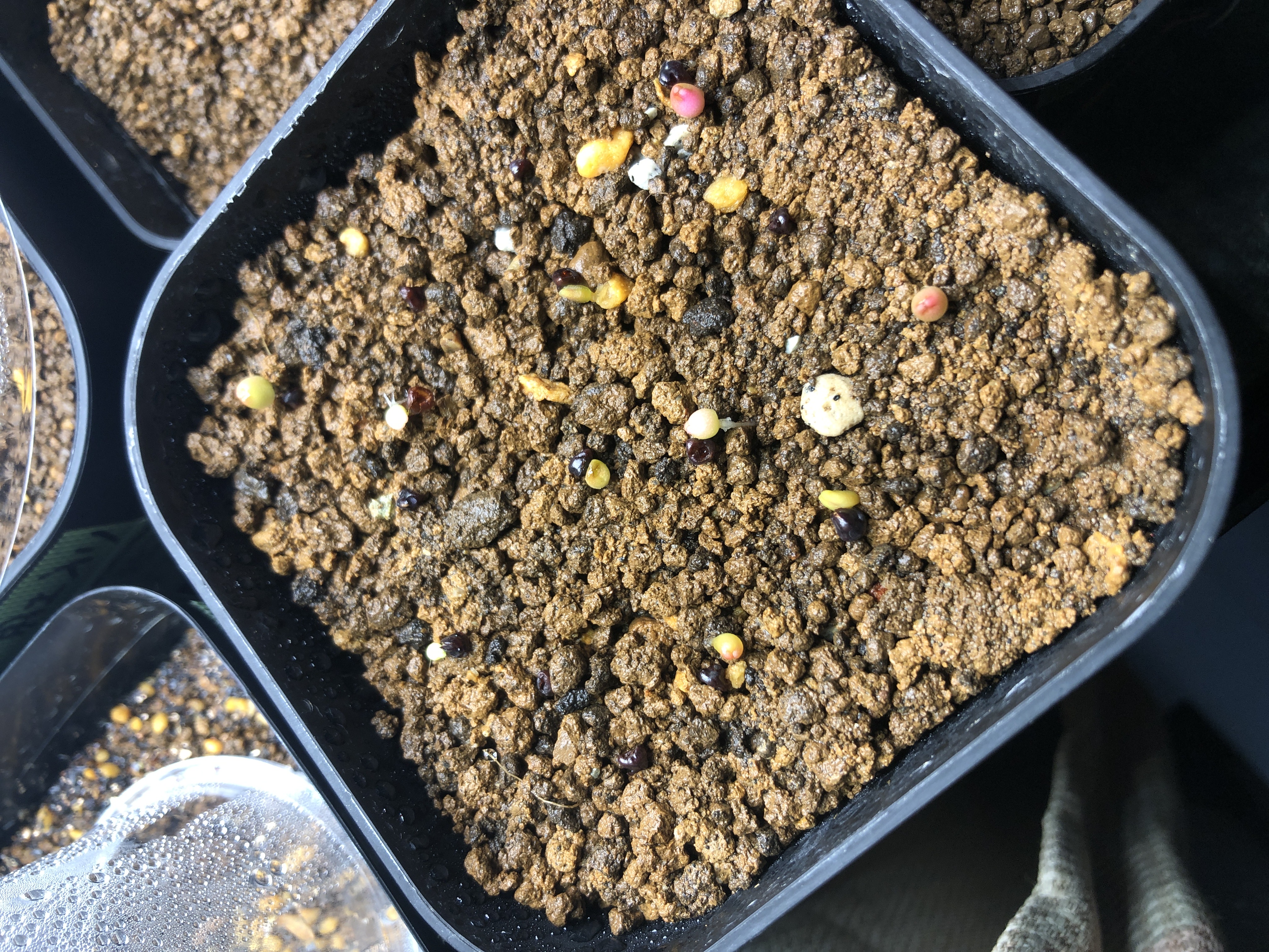 鉢内温度27℃に加温 12粒中10粒発芽しました。