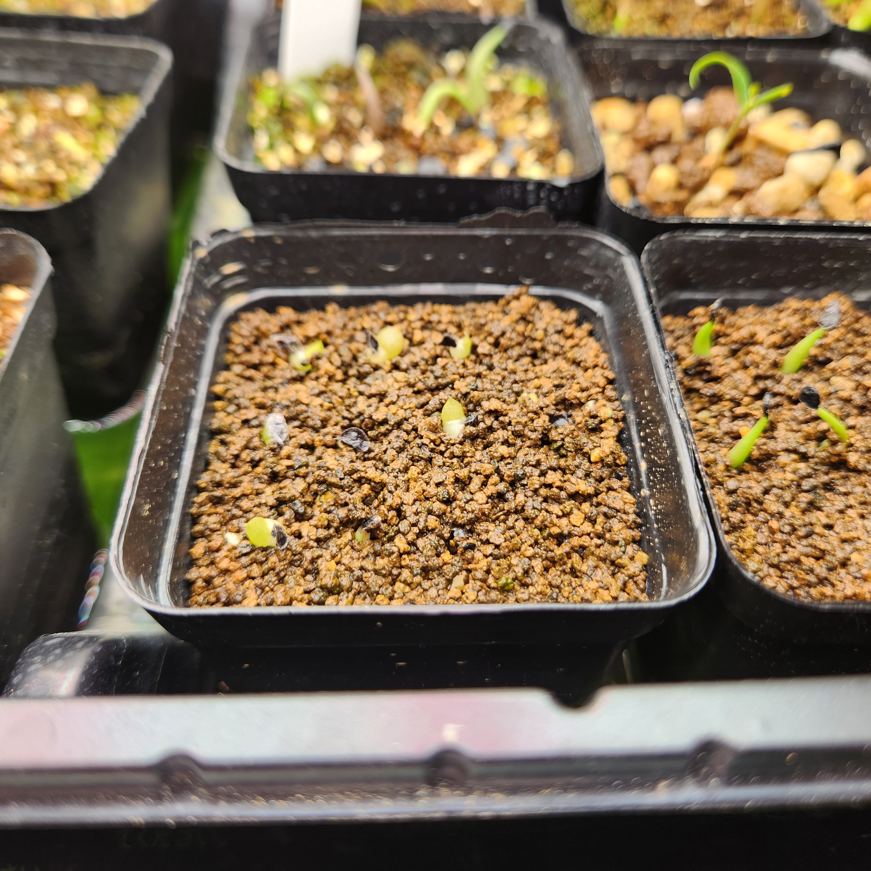 植え付けは育成用土をプラ鉢の半分。その上に赤玉土細粒を3cmほど。腰水管理で25℃前後で管理中です。