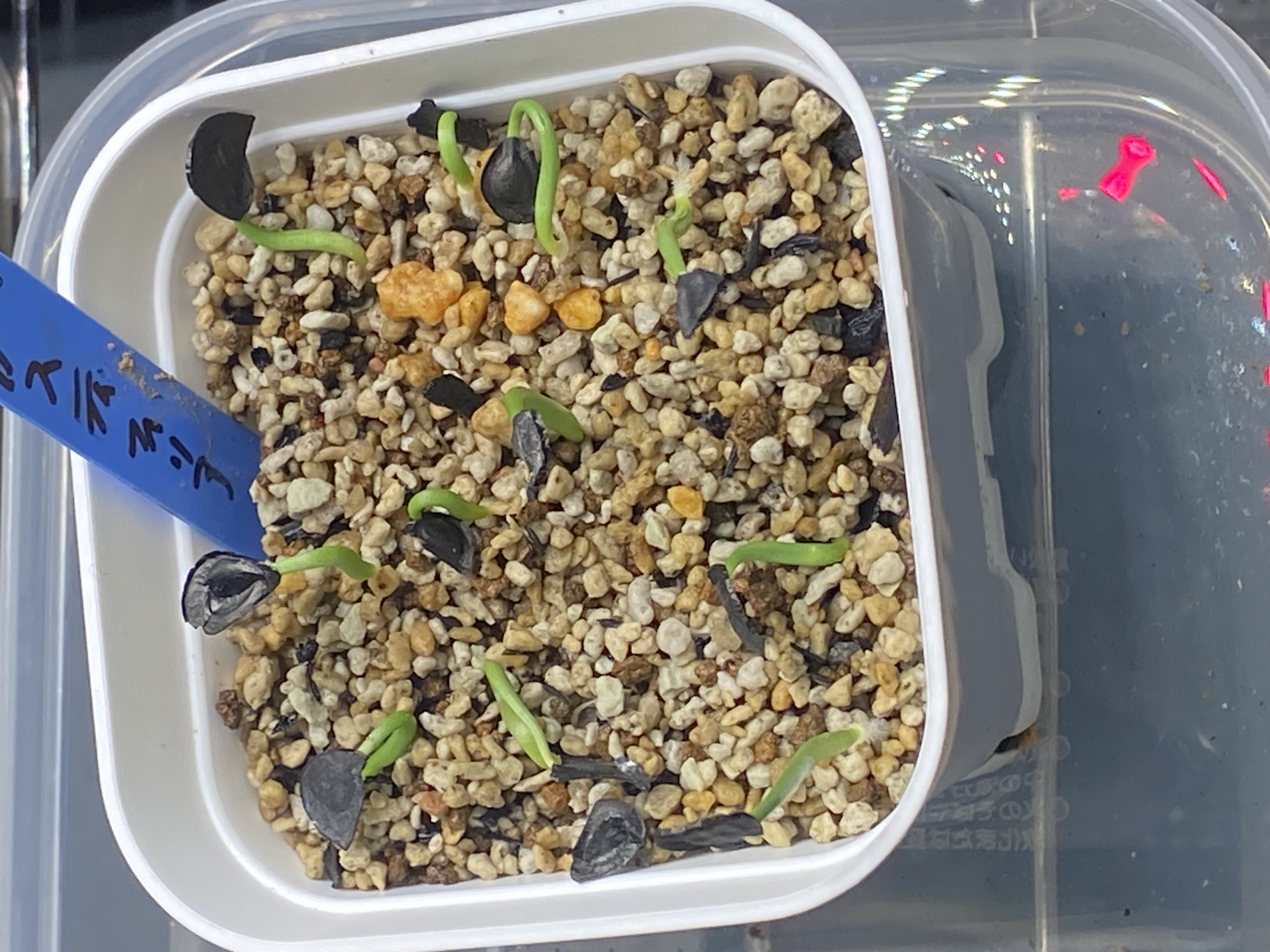 [ 播種日 / 撮影日 ]2024/4/13播種 2024/4/17撮影[ 播種数 / 発芽数 ]12粒/ 12粒[ その他(用土や管理方法など)]播種前にダコニール+メネデール溶液に半日程度浸漬市販の多肉の土を敷き播種、ヒートマットで25度で管理