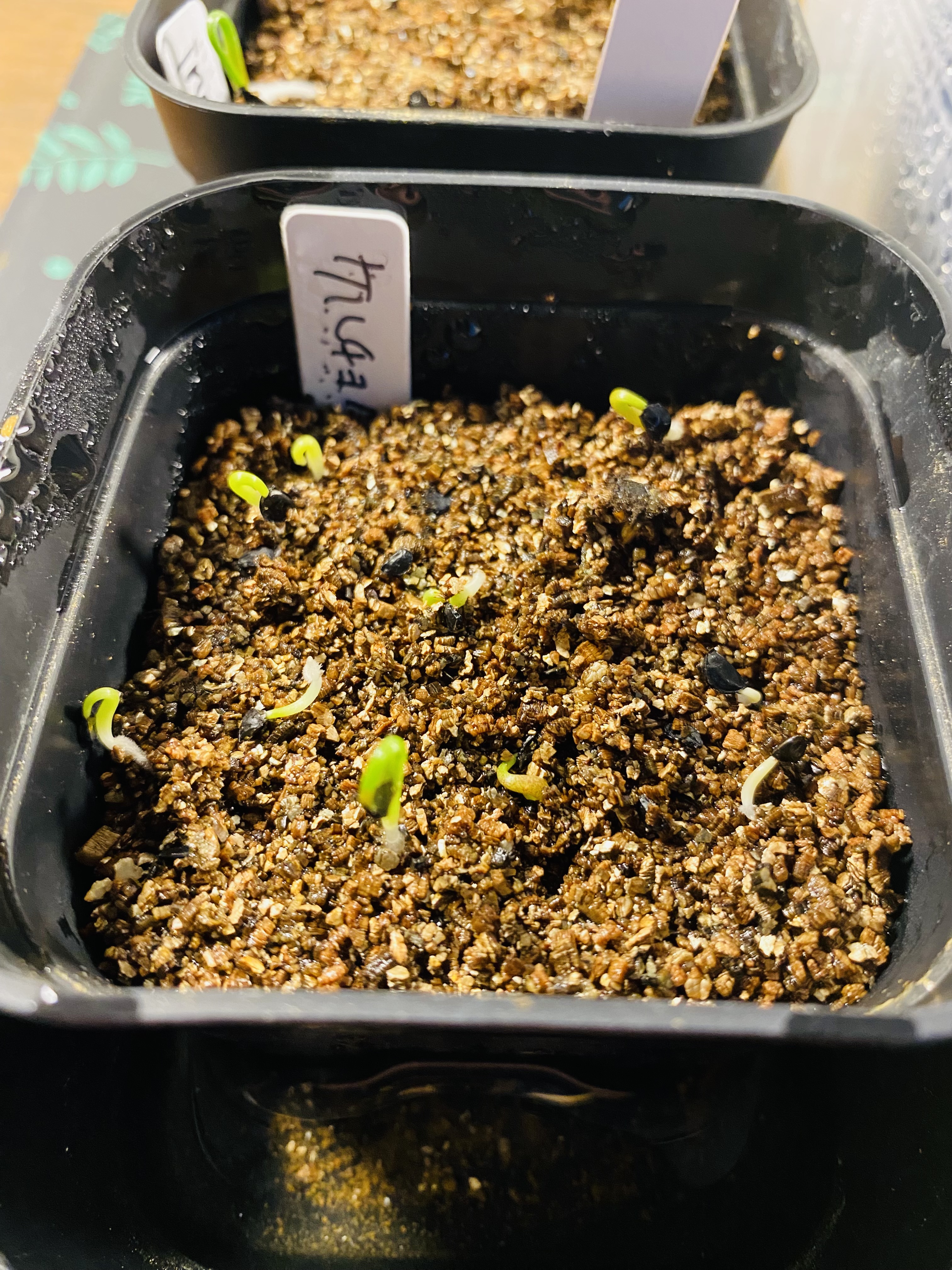[ 播種日 / 撮影日 ]2024/4/19播種 2024/4/29[ 播種数 / 発芽数 ]50粒/10粒[ その他(用土や管理方法など)]メネデール溶液に1日程度浸漬赤玉メインの用土に細目のバーミキュライトを敷き播種、20度〜25度で管理