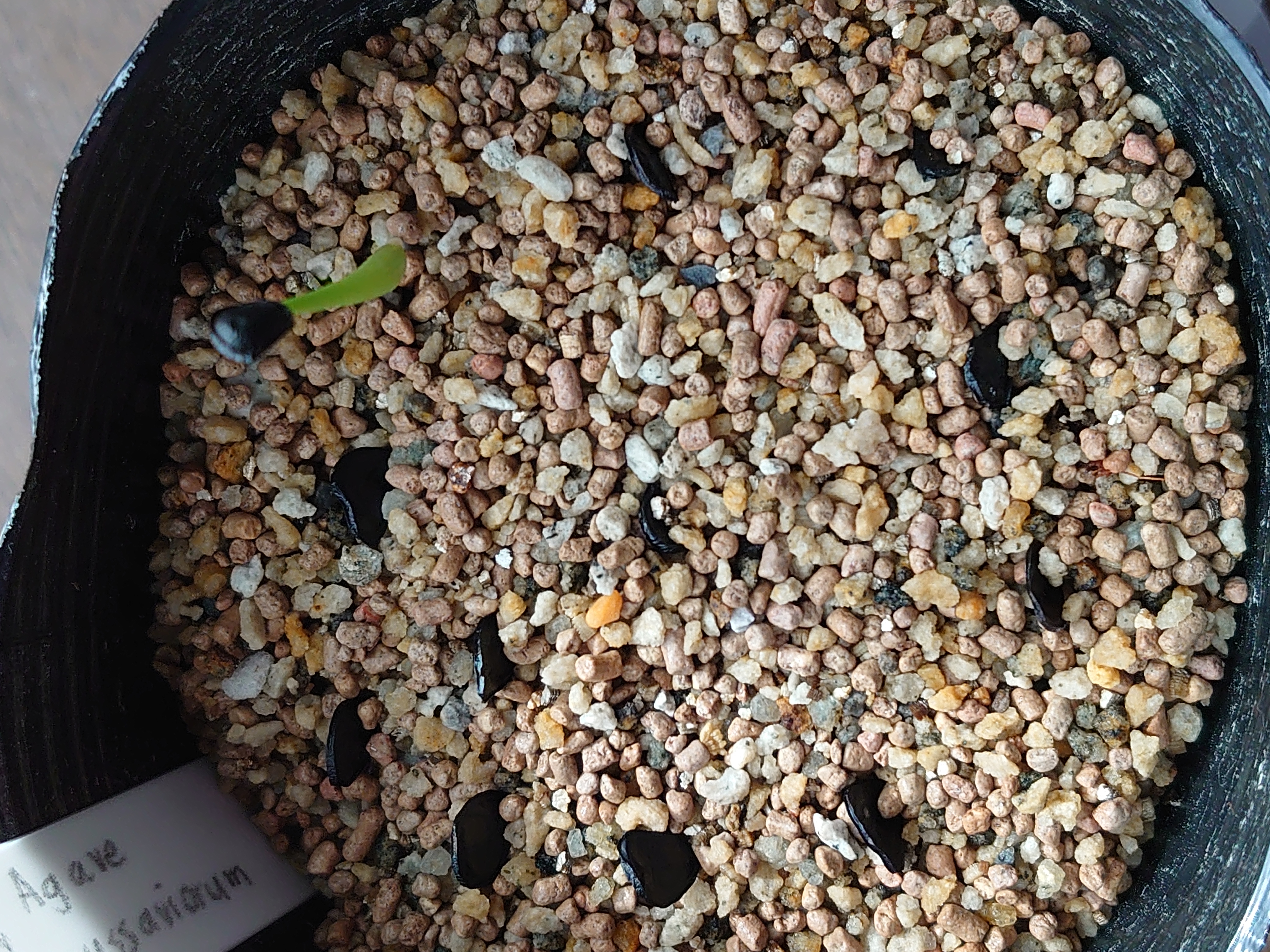 赤玉メインの用土にホームセンターで売ってる細か目のサボテン・多肉植物用土を敷き播種、18度〜28度で管理