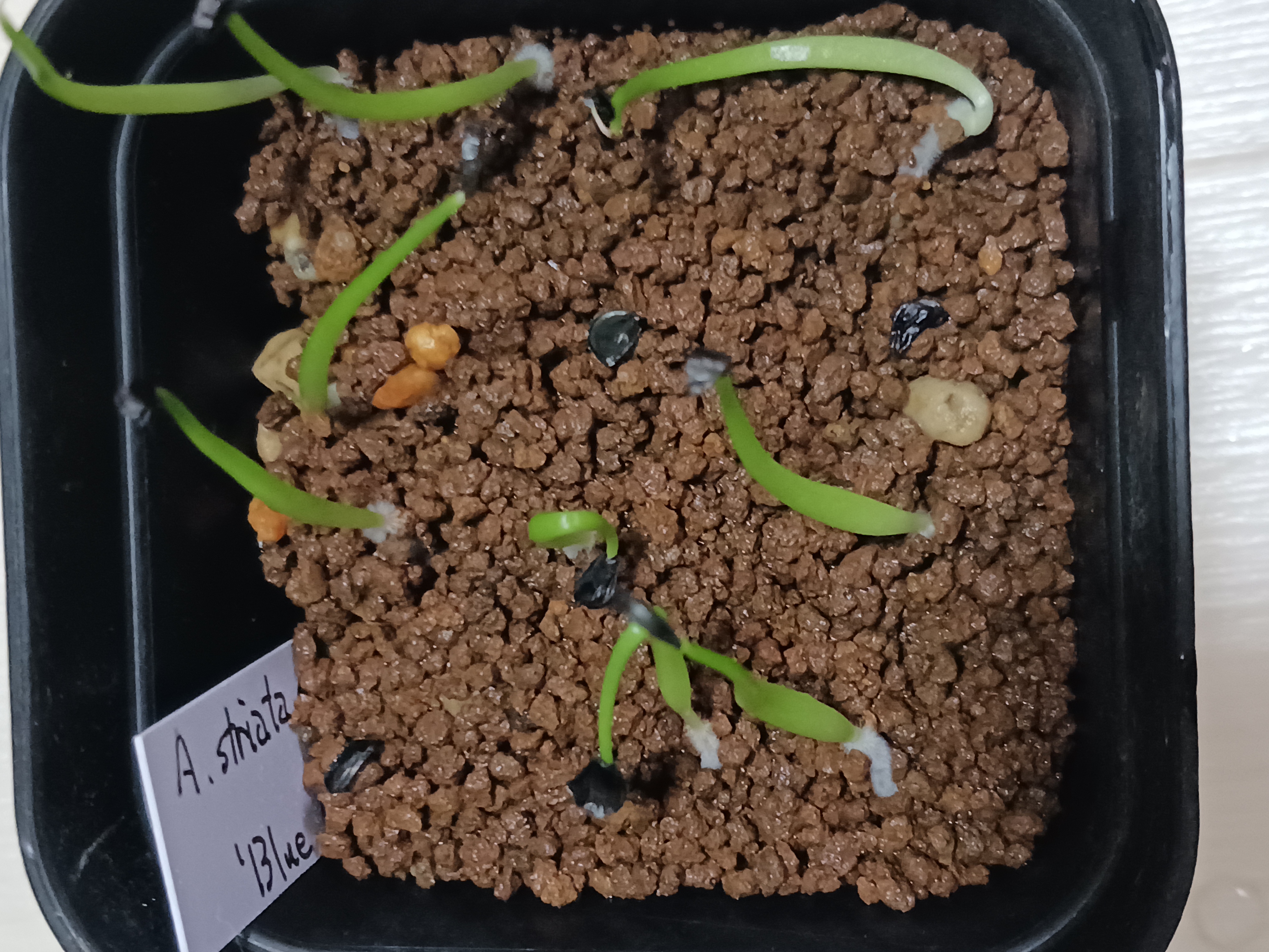 [ 播種日 / 撮影日 ]2024/4/27播種 2024/5/14撮影[ 播種数 / 発芽数 ]13粒/ 10粒[ その他(用土や管理方法など)]小粒赤玉鹿沼軽石混合土の上に細粒赤玉を敷き播種して
