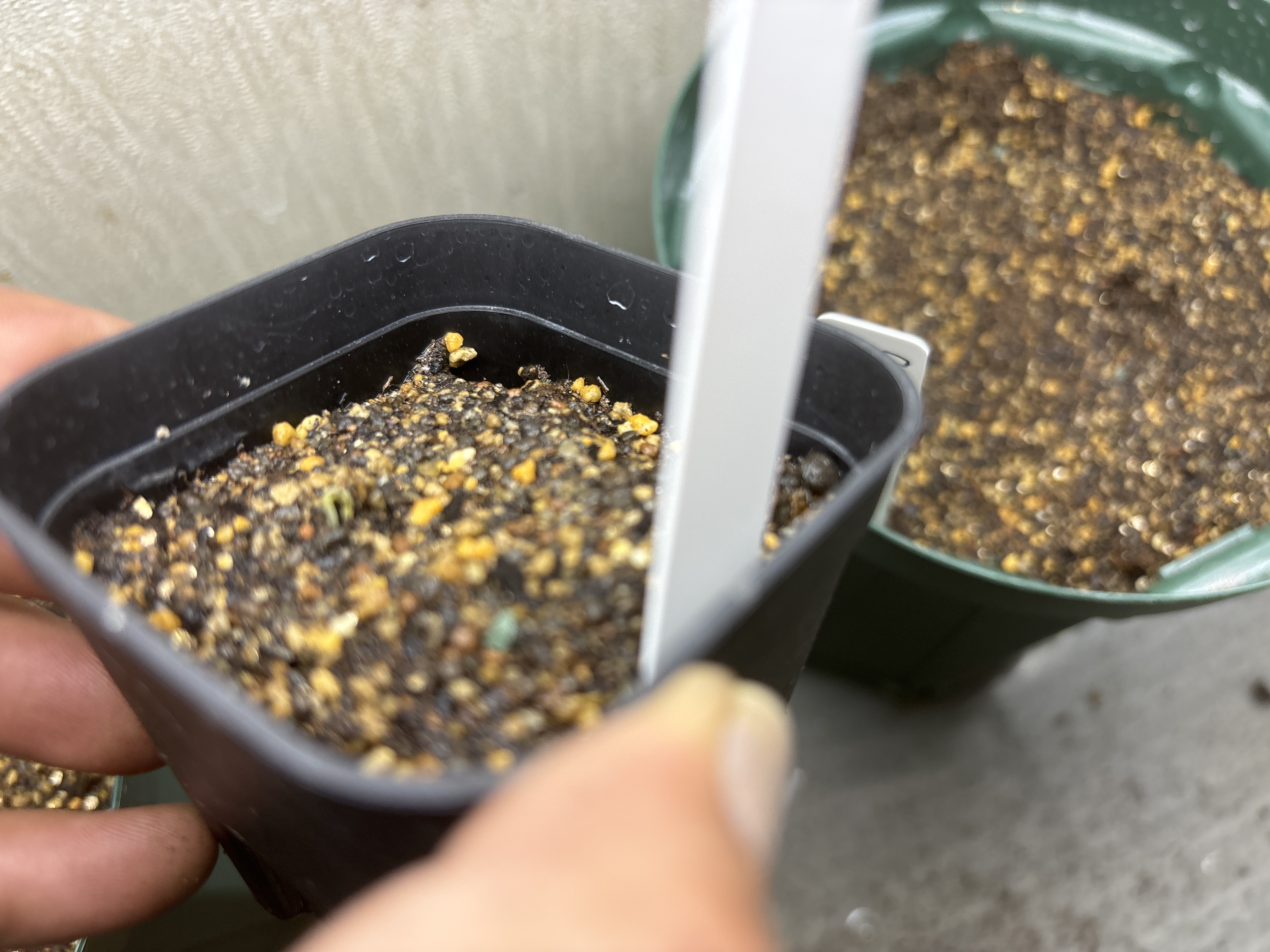 乾いた種子の状態で蓋をあけその後メネデールを入れた水にひたし1日放置したのち水槽の中で腰水管理。