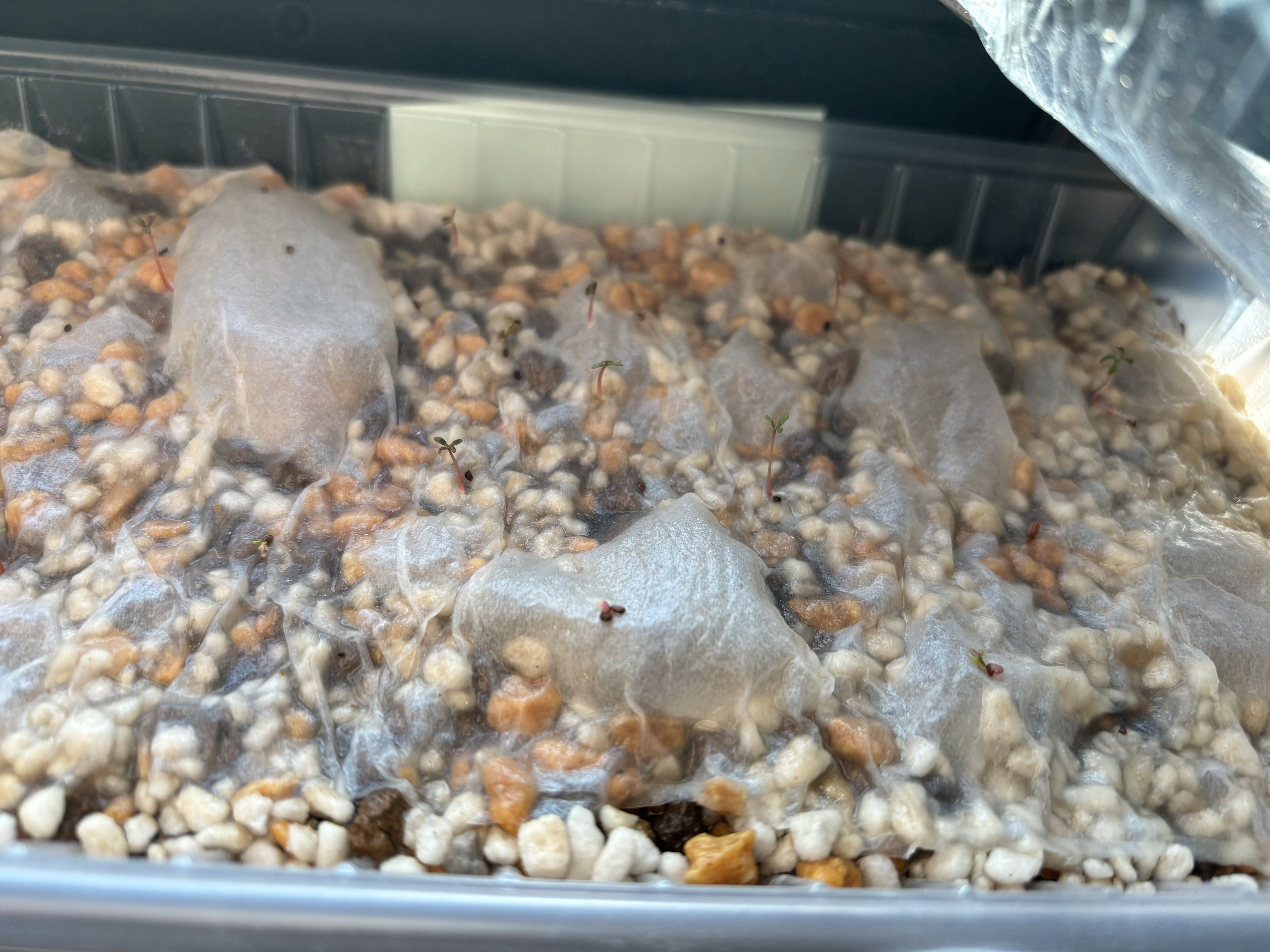 [ 播種日 / 撮影日 ]例: 2024/5/11播種 2024/5/18撮影[ 播種数 / 発芽数 ]例: 13粒/ 10粒[ その他(用土や管理方法など)]播種前にベンレート+メネデール溶液に半日程度浸漬多肉用の排水性が良い土にトイレットペーパーを敷き播種、水はたっぷり与え、蓋して保湿。常温20度〜25度で管理