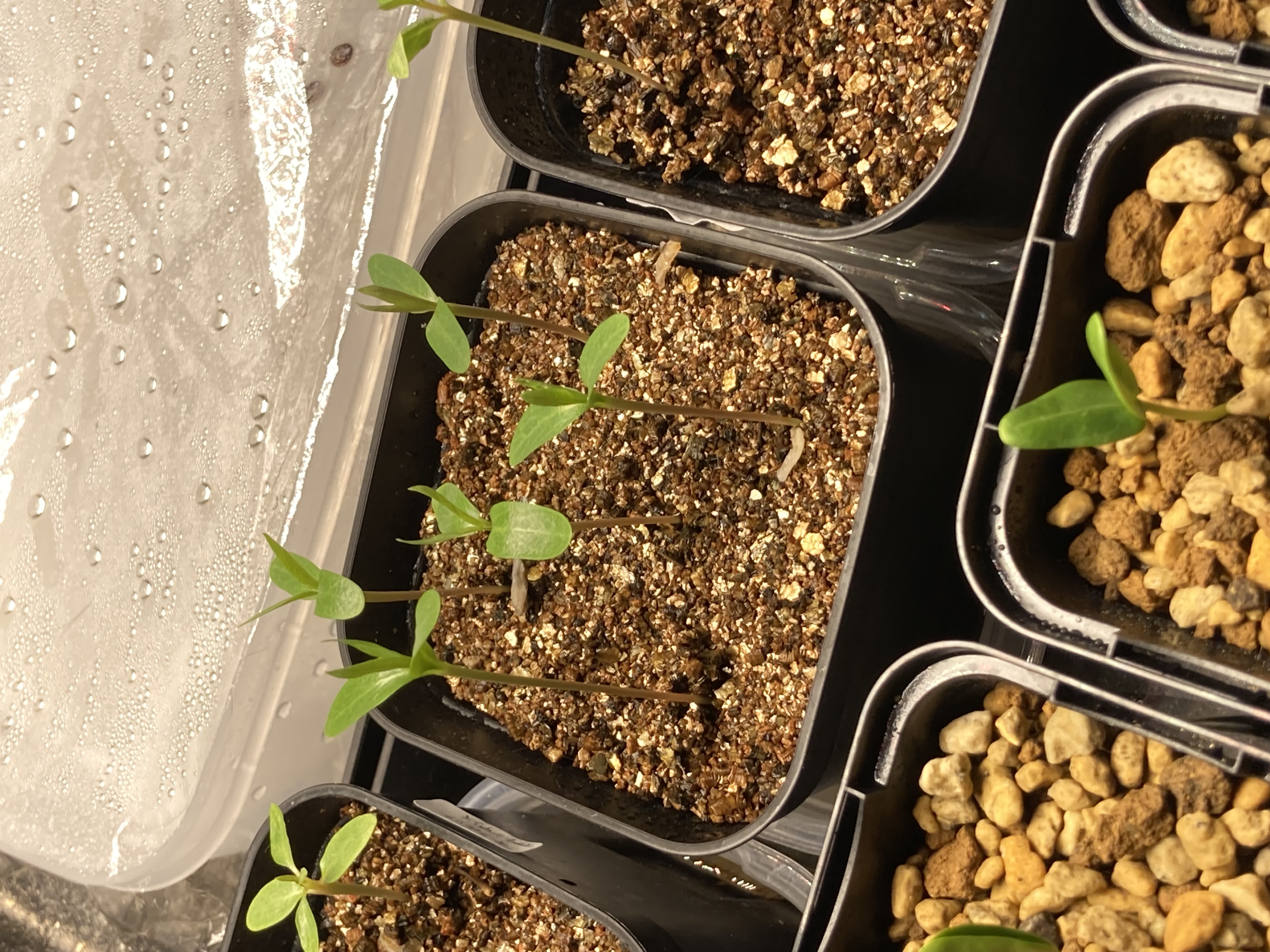 メネデール+ベンレートに一晩漬けキッチンペーパーで発根したものから赤玉にバーミキュライトを敷いた用土に播種