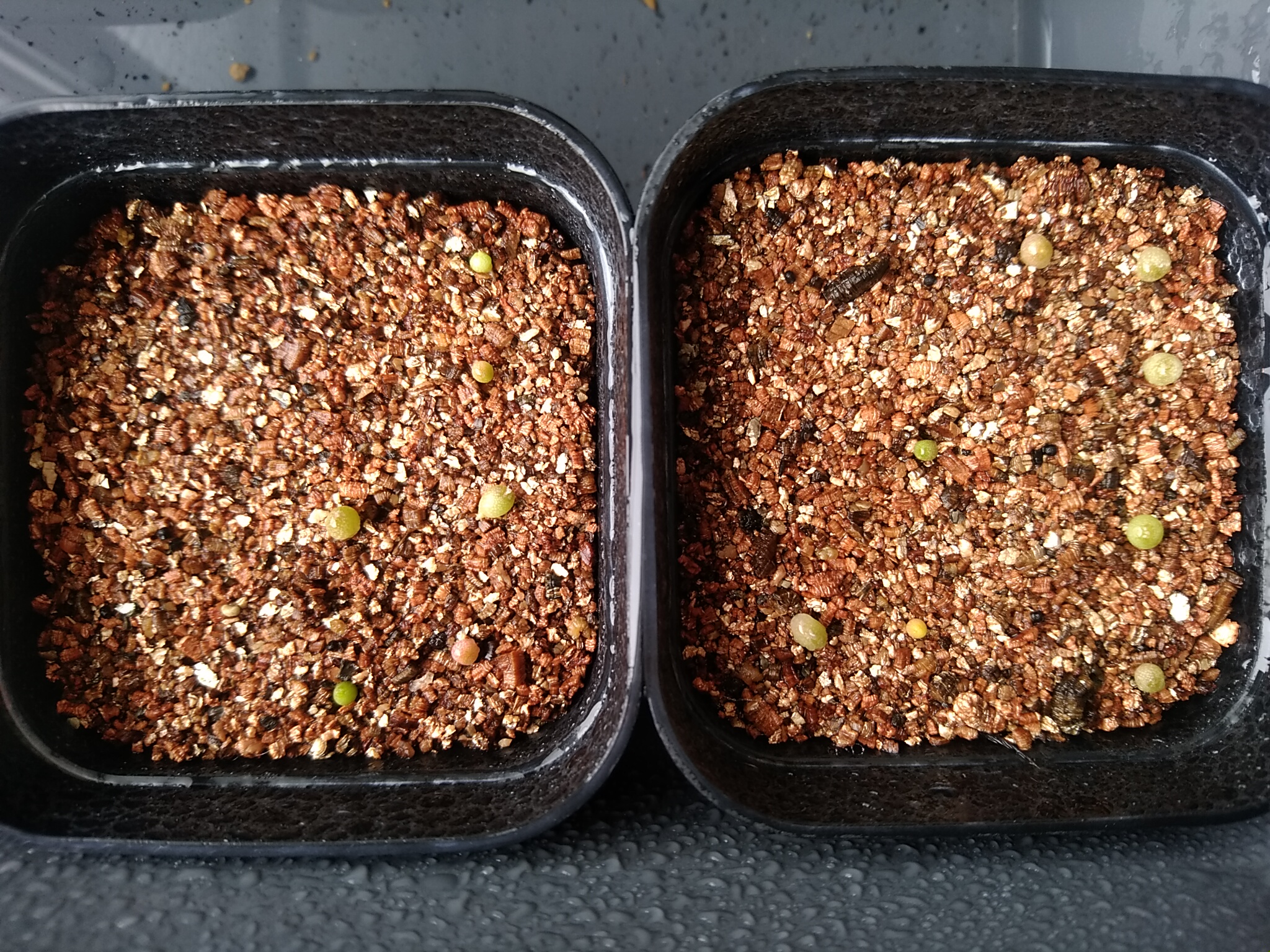 日向土メインのブレンドサボテン用土に細目のバーミキュライトを敷き播種しベンレート+メネデール溶液を霧吹きして殺菌。殺菌は1日3回程度。