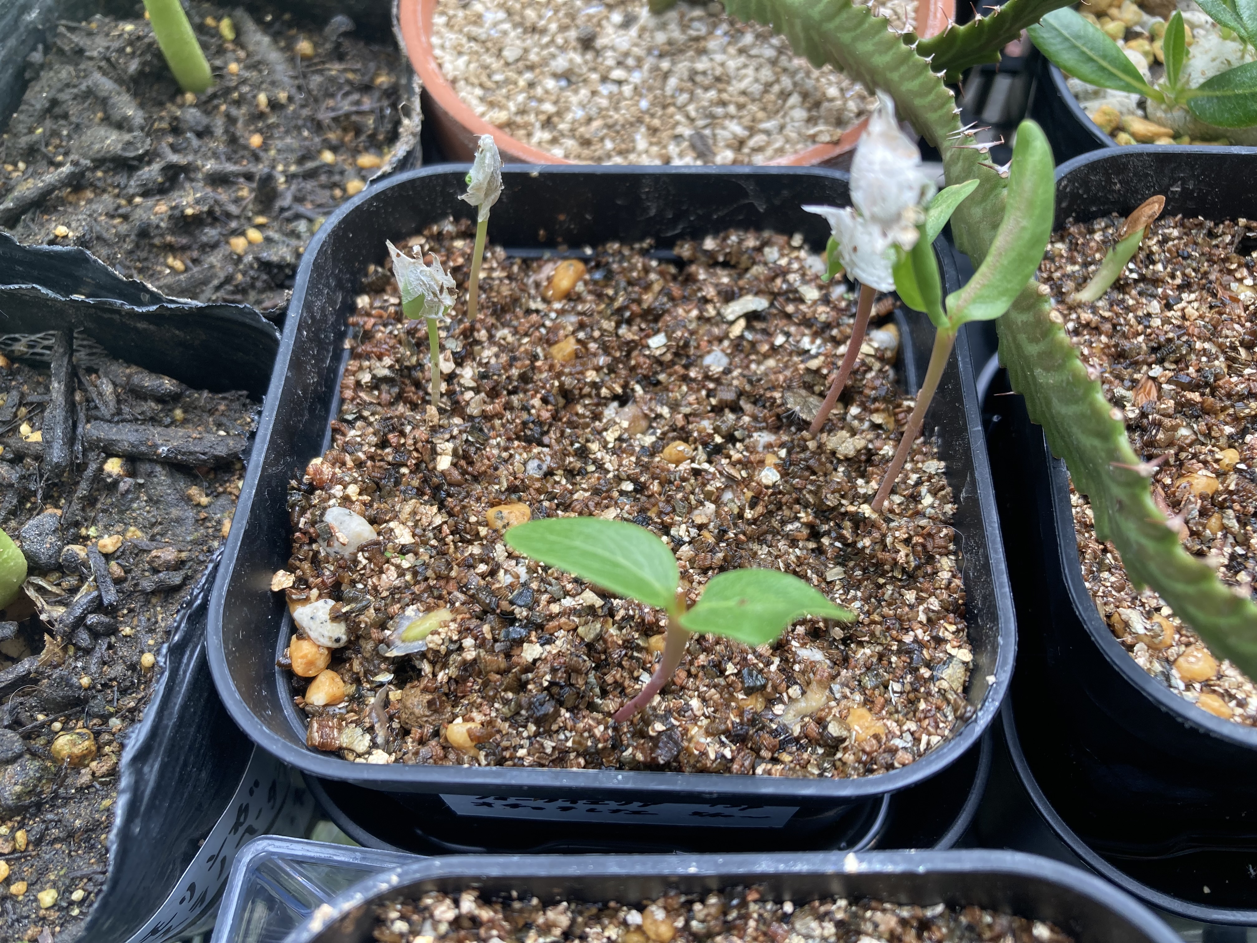 小粒の軽石、鹿沼土、赤土を1:1:1で配合した培養土に保湿用のバーミキュライトを薄く敷き詰め、その上に種(播種前に半日程メネデール浸水)を置いてさらにバーミキュライトを被せ、東向きの日向で腰水管理。