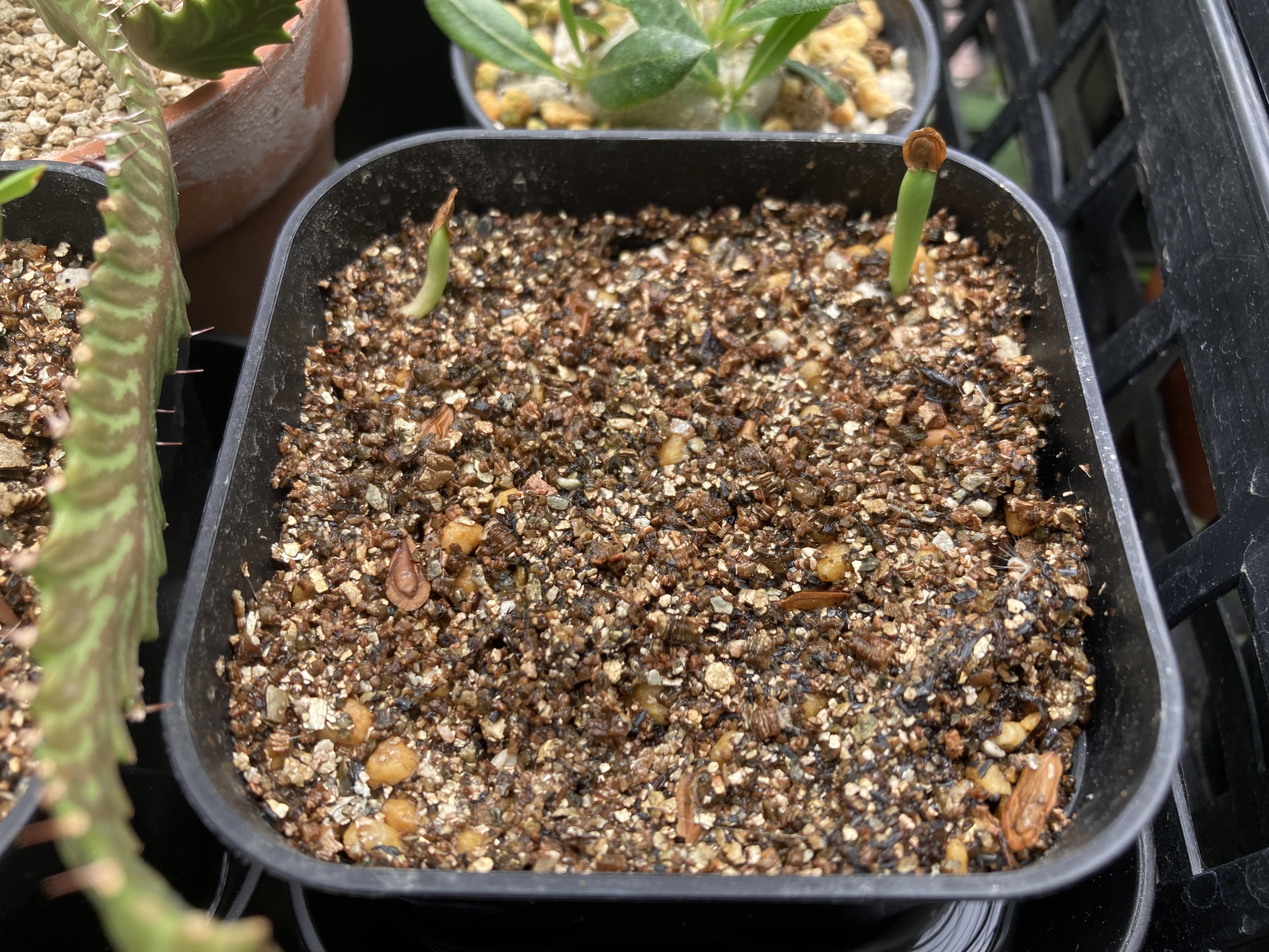 小粒の軽石、鹿沼土、赤土を1:1:1で配合した培養土に保湿用のバーミキュライトを薄く敷き詰め、その上に種(播種前に半日程メネデール浸水)を置いてさらにバーミキュライトを被せ、東向きの日向で腰水管理。