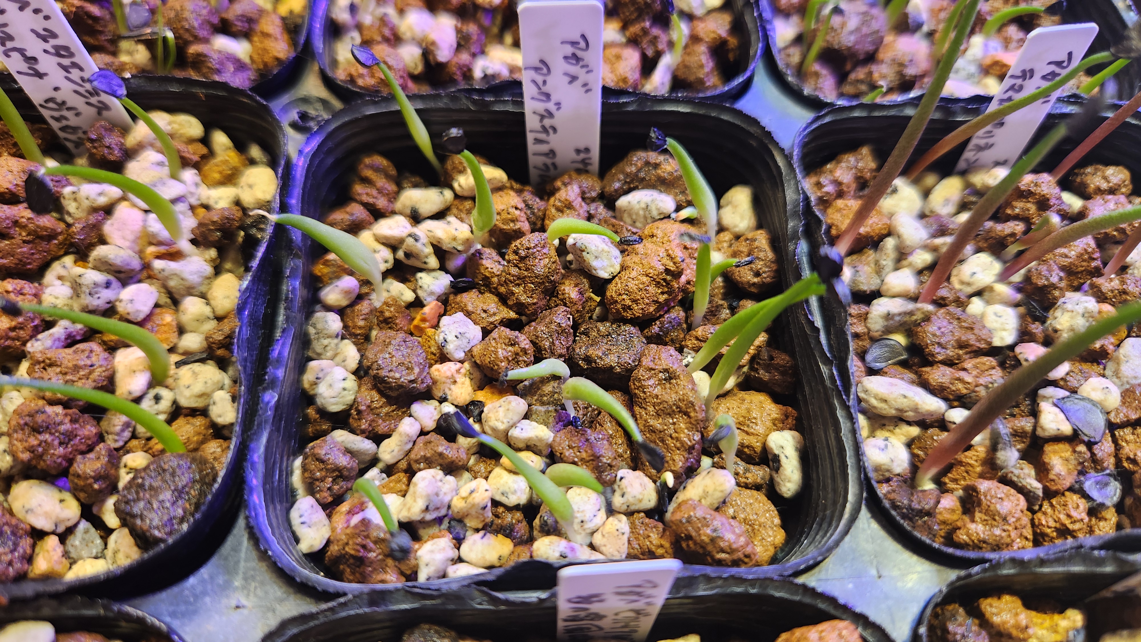 赤玉軽石パーライト少々、殺菌剤あり、腰水、屋外管理