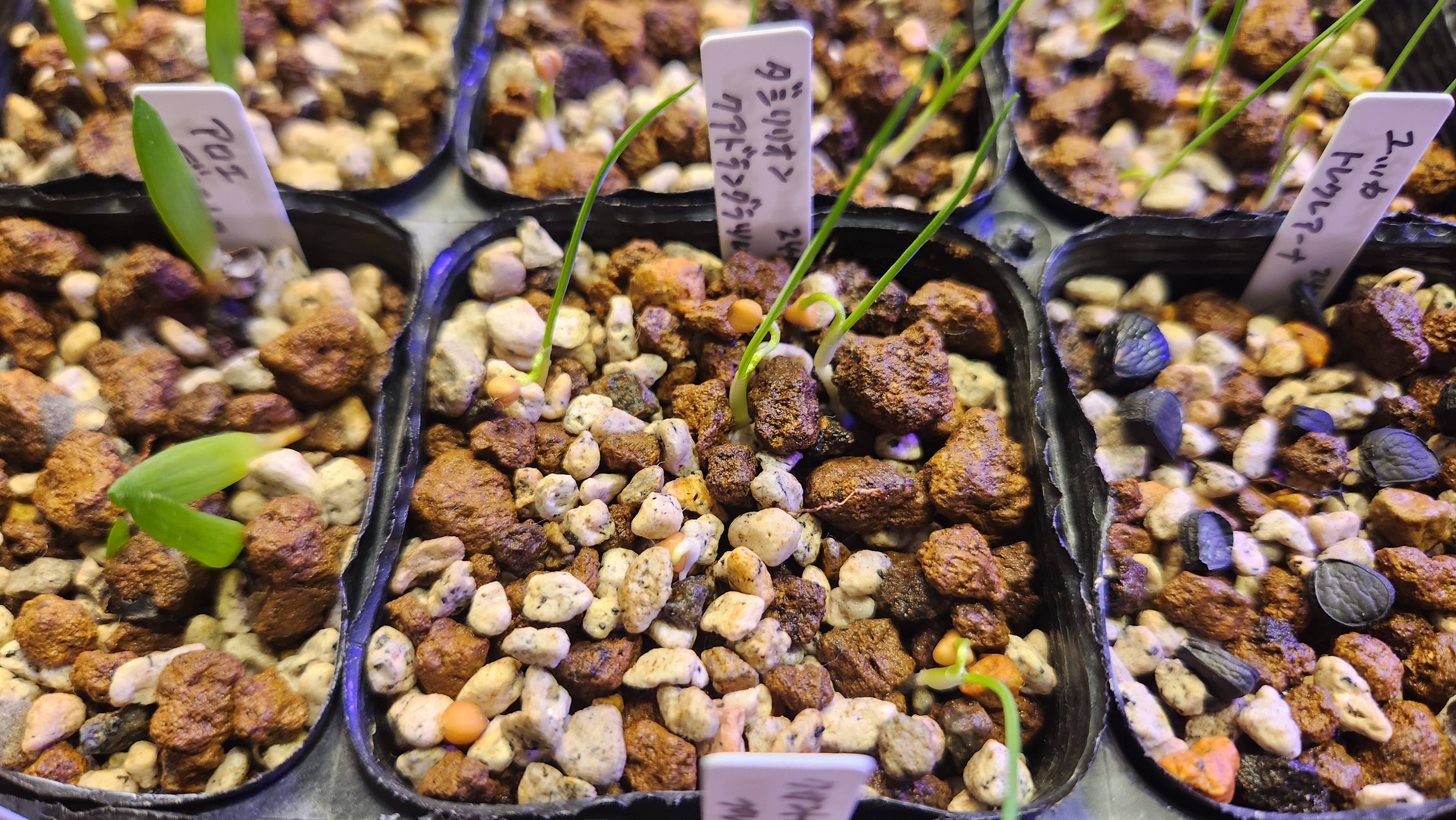 赤玉軽石パーライト少々、殺菌剤あり、腰水、屋外管理