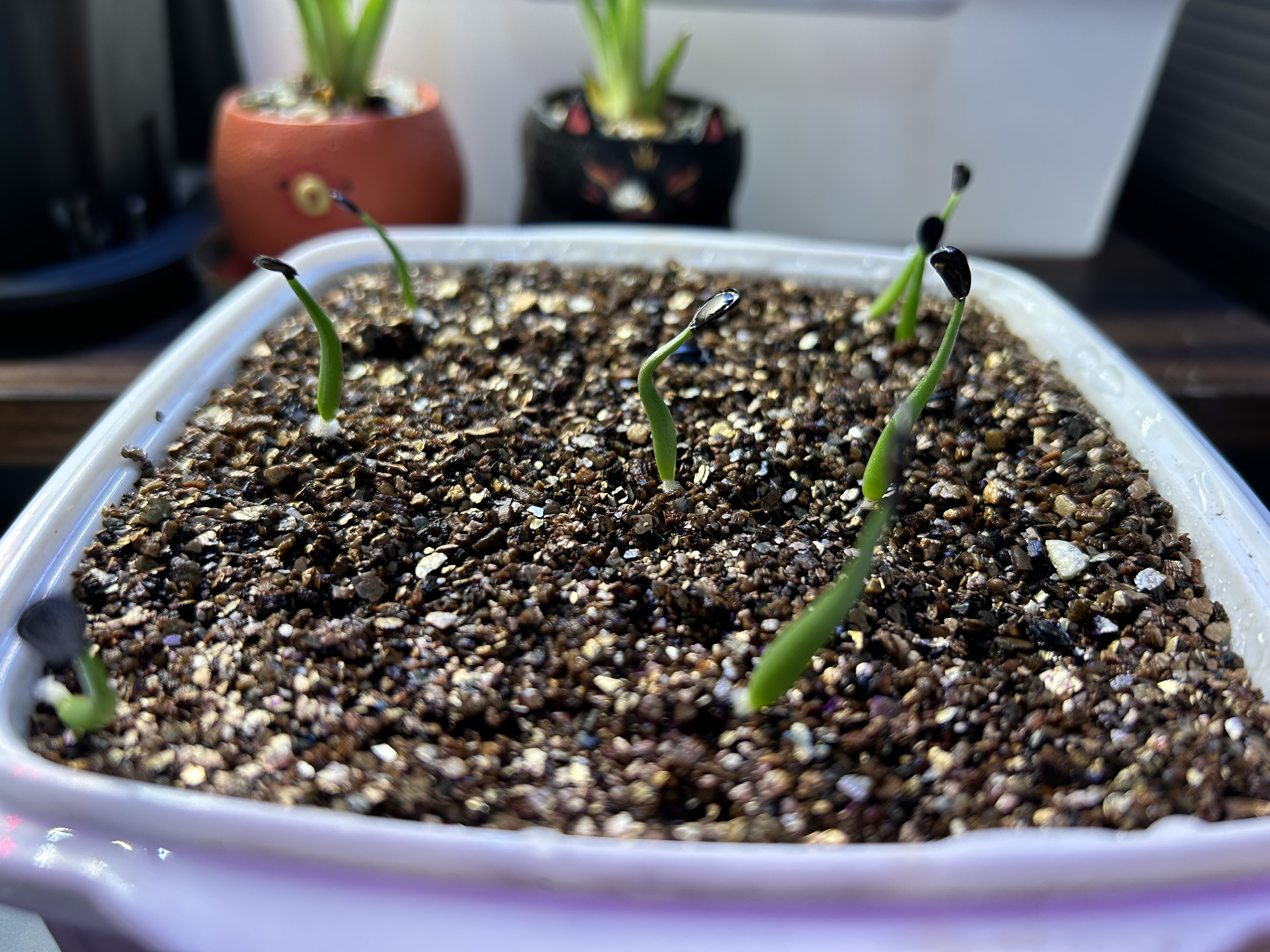 [ 播種数 / 発芽数 ]10粒/ 9粒[ その他(用土や管理方法など)]播種前にメネデールに数時間つけ置きして赤玉と軽石メインの用土に細目のバーミキュライトを敷き播種、24度100%湿度で管理しています。