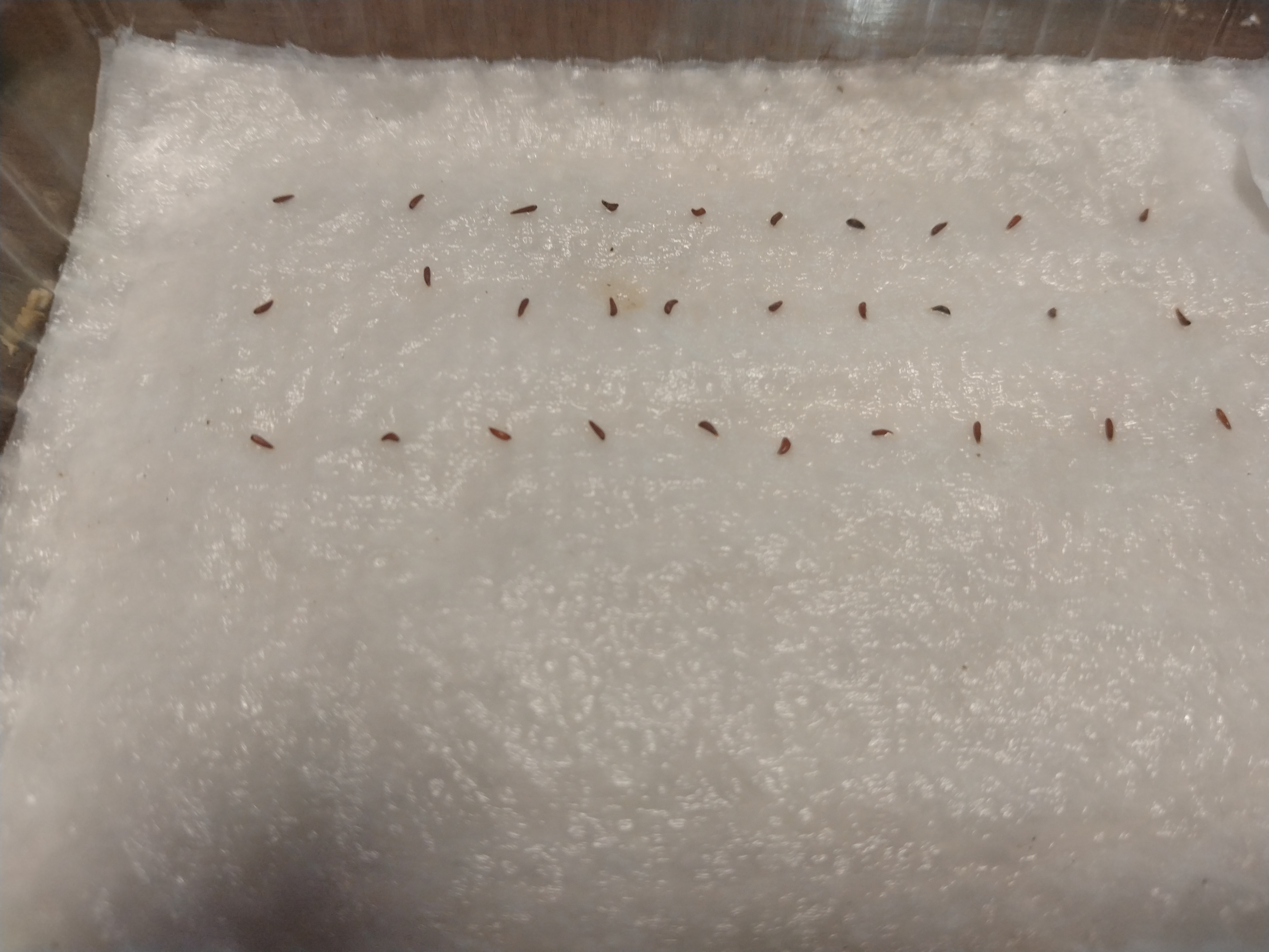 5/23 発芽率・期間等の情報がないため、とりあえずキッチンペーパーに播種、メネデール・ベンレート水溶液にひたひた、室内管理