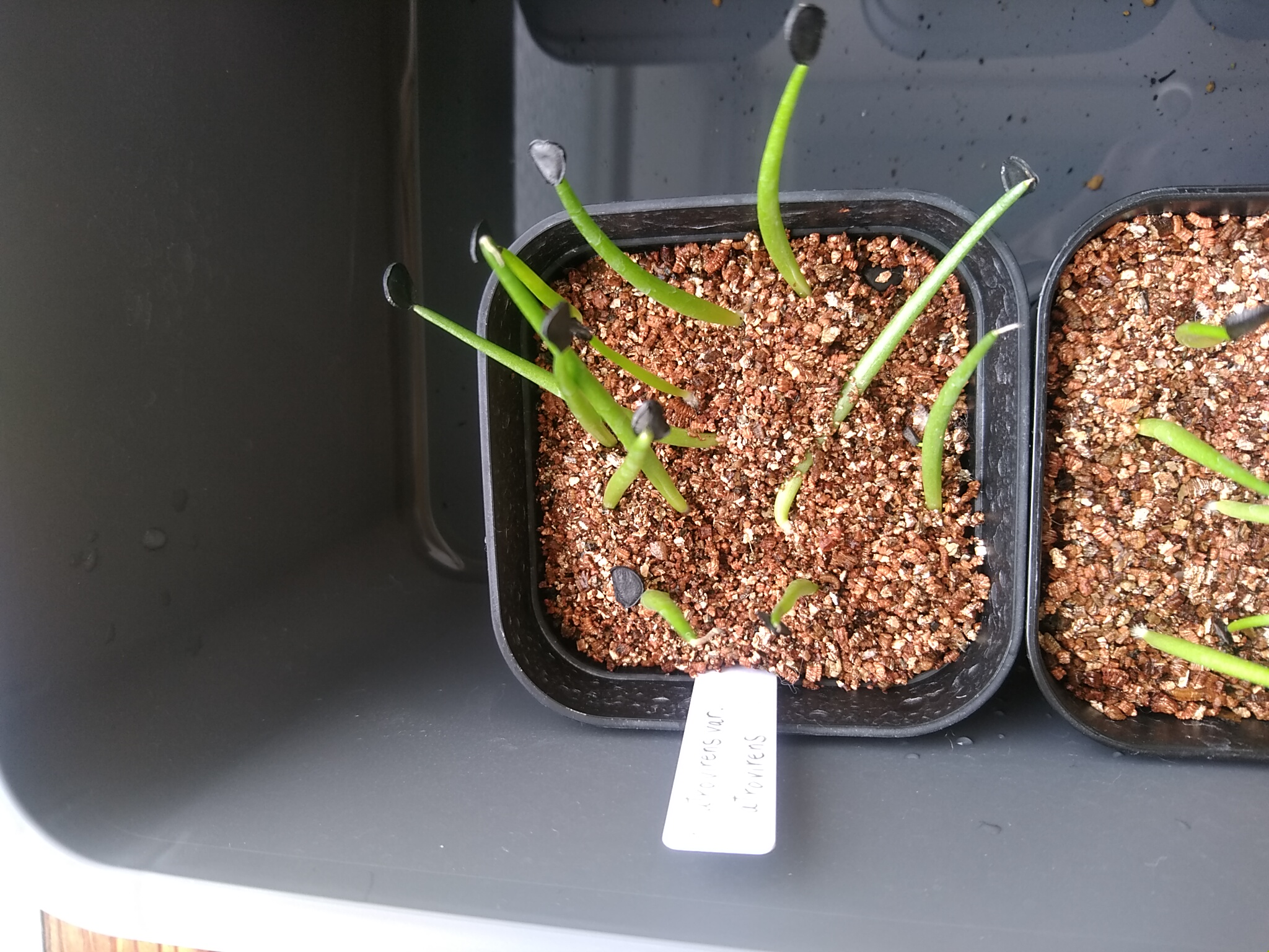 日向土メインのブレンドサボテン用土に細目のバーミキュライトを敷き播種、25度程度で腰水、ラップをして管理。