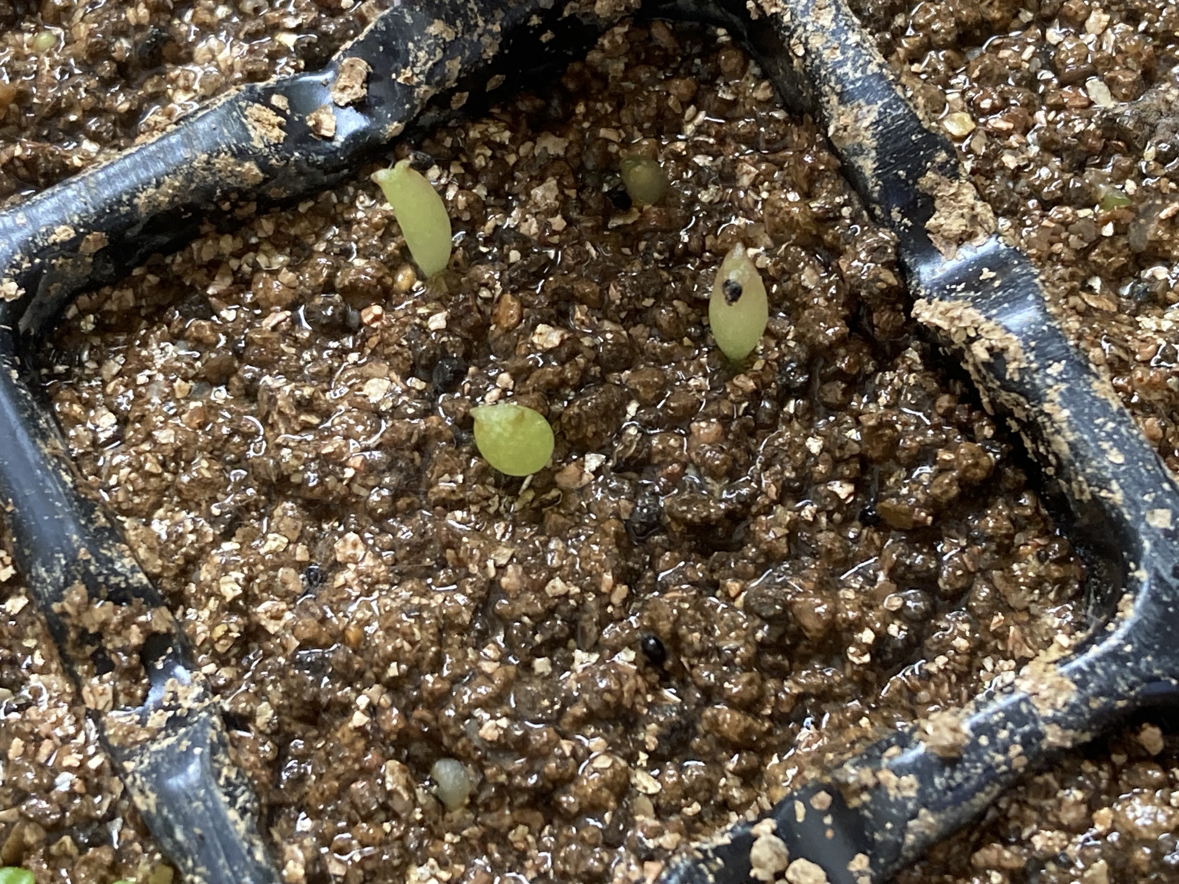 5月中旬に播種、6月上旬に撮影。10粒+αを蒔き、9粒発芽、その後3粒が溶けて6株になりました。赤玉土とバーミキュライトを混ぜた土を使い、無加温の室内で腰水管理。オーソサイド水和剤使用。