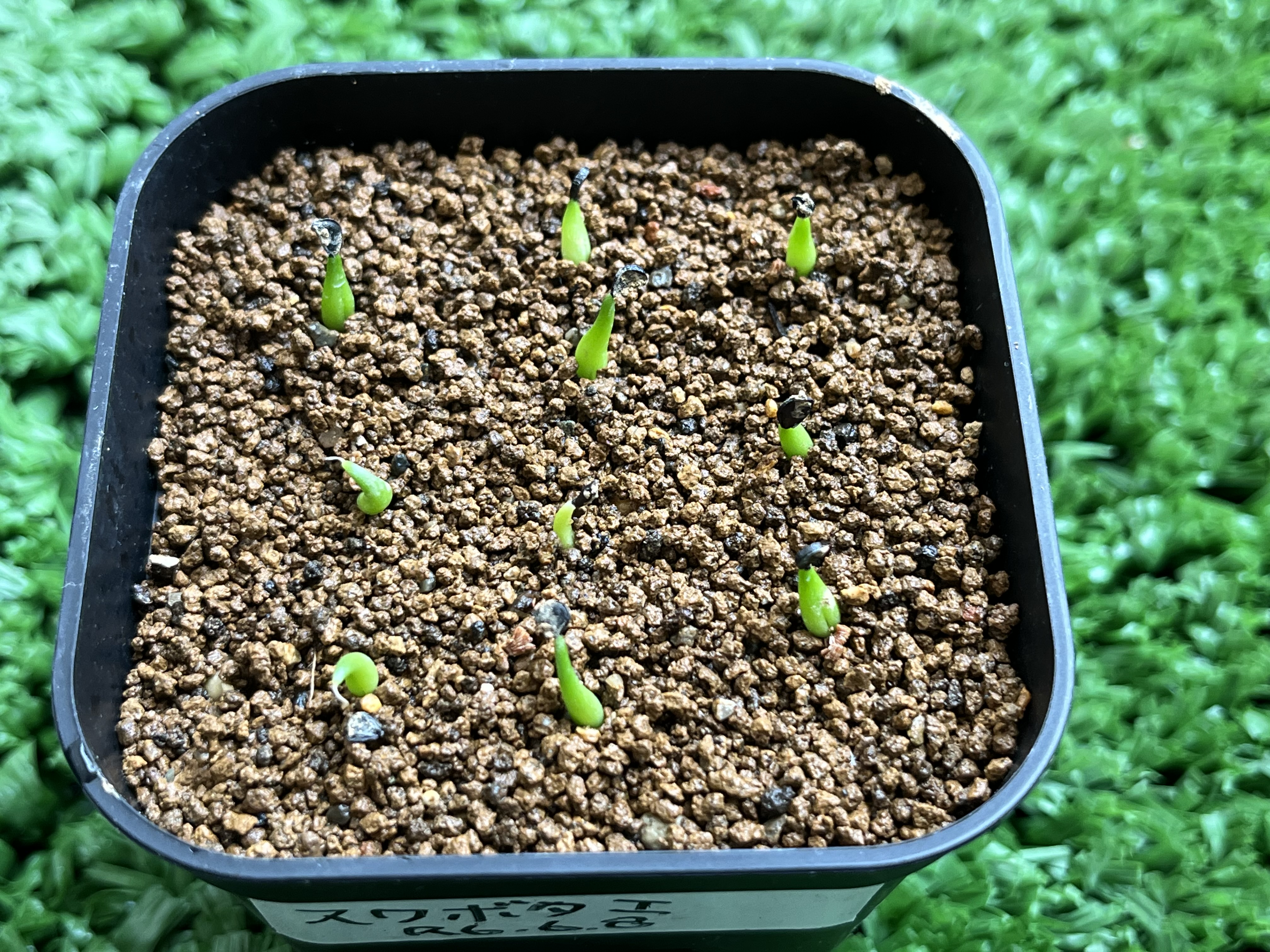 [ 播種日 / 撮影日 ]2024/6/8播種 2024/6/15撮影[ 播種数 / 発芽数 ]12粒/ 10粒[ 管理方法]播種前にダコニール+メネデール溶液に半日程度浸漬赤玉+鹿沼土+軽石の用土に細目のバーミキュライトを敷き播種