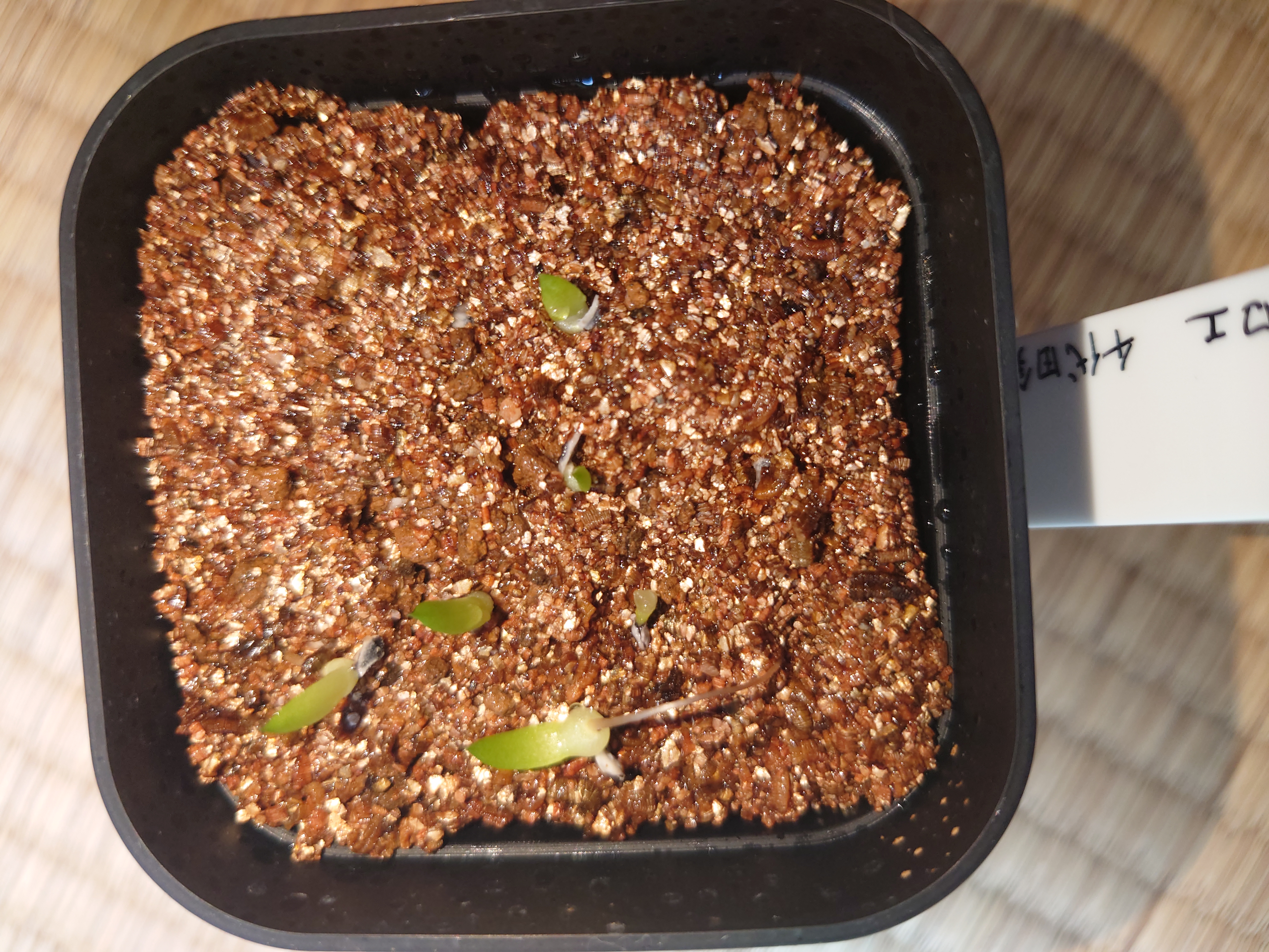 [ 播種日 / 撮影日 ]2024/6/4播種 2024/6/15撮影[ 播種数 / 発芽数 ] 11粒/ 6粒[ その他(用土や管理方法など)]播種前にメネデール溶液に10時間程度浸漬赤玉土の上にバーミキュライトを敷き播種
