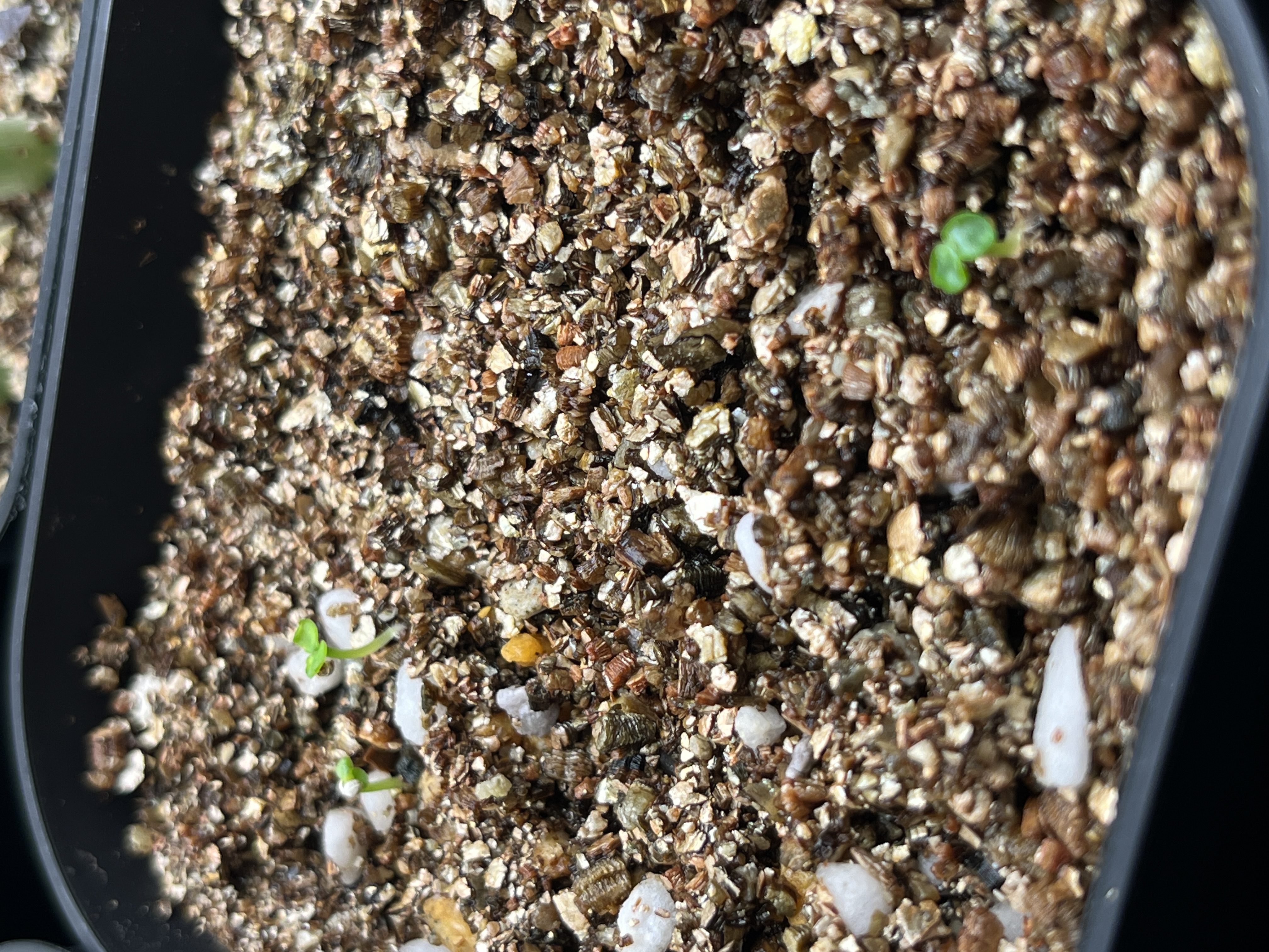 ベンレートとメネデール溶液に一晩つけた後、多肉用土の上にバーミキュライトひいて密閉腰水管理です。1週間以上経ってやっと3粒発芽しました。