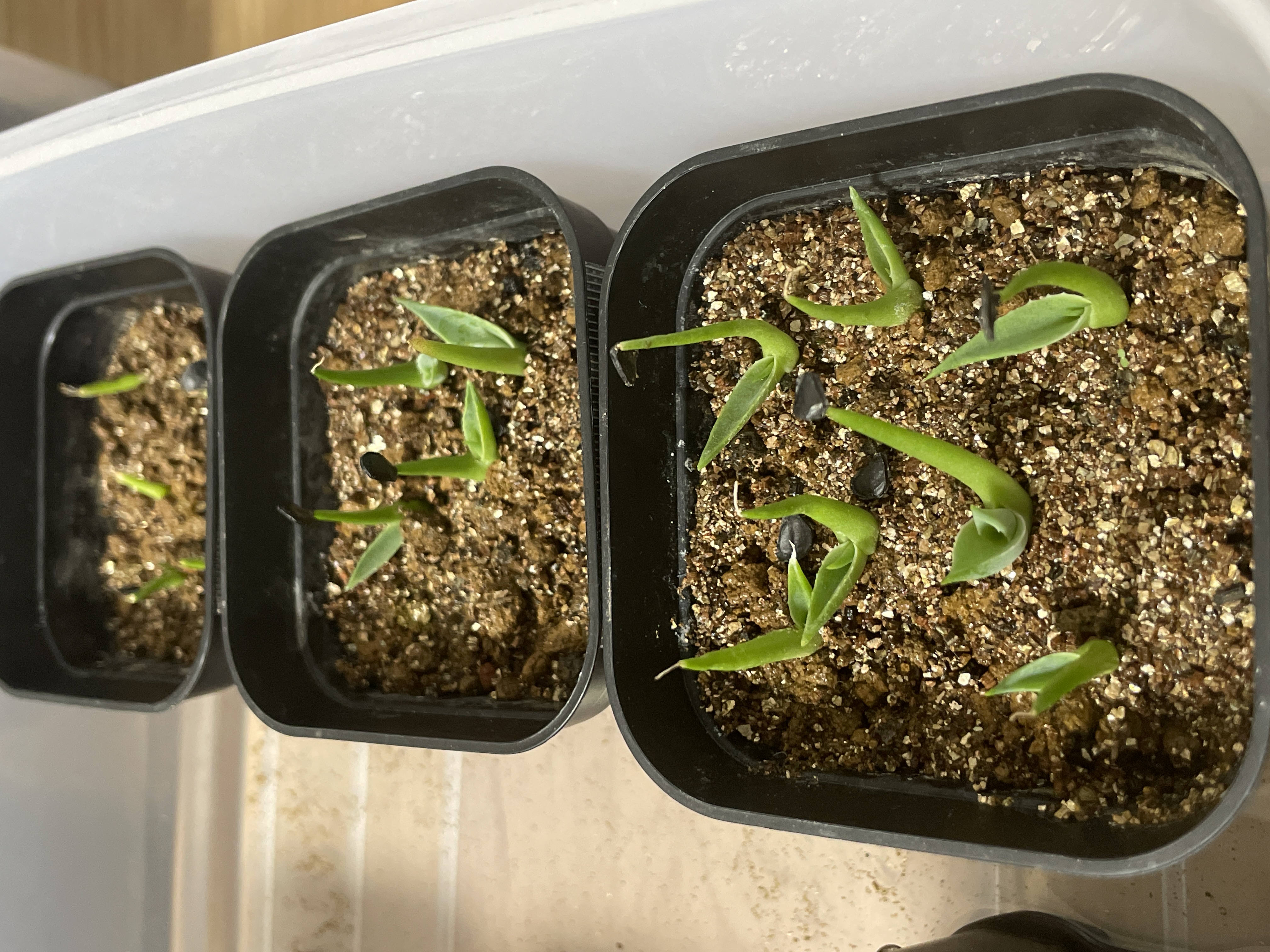 初めは用土の上に播種して発芽を待っていましたが、11粒しか発芽しなかったため、発芽しなかった種を水に漬けて根が出てから植え替えました。初めの11粒はしっかり育っていますが、途中まで水中で育った5粒は弱々しい状態なのでメネデールなどで復活を祈っています。